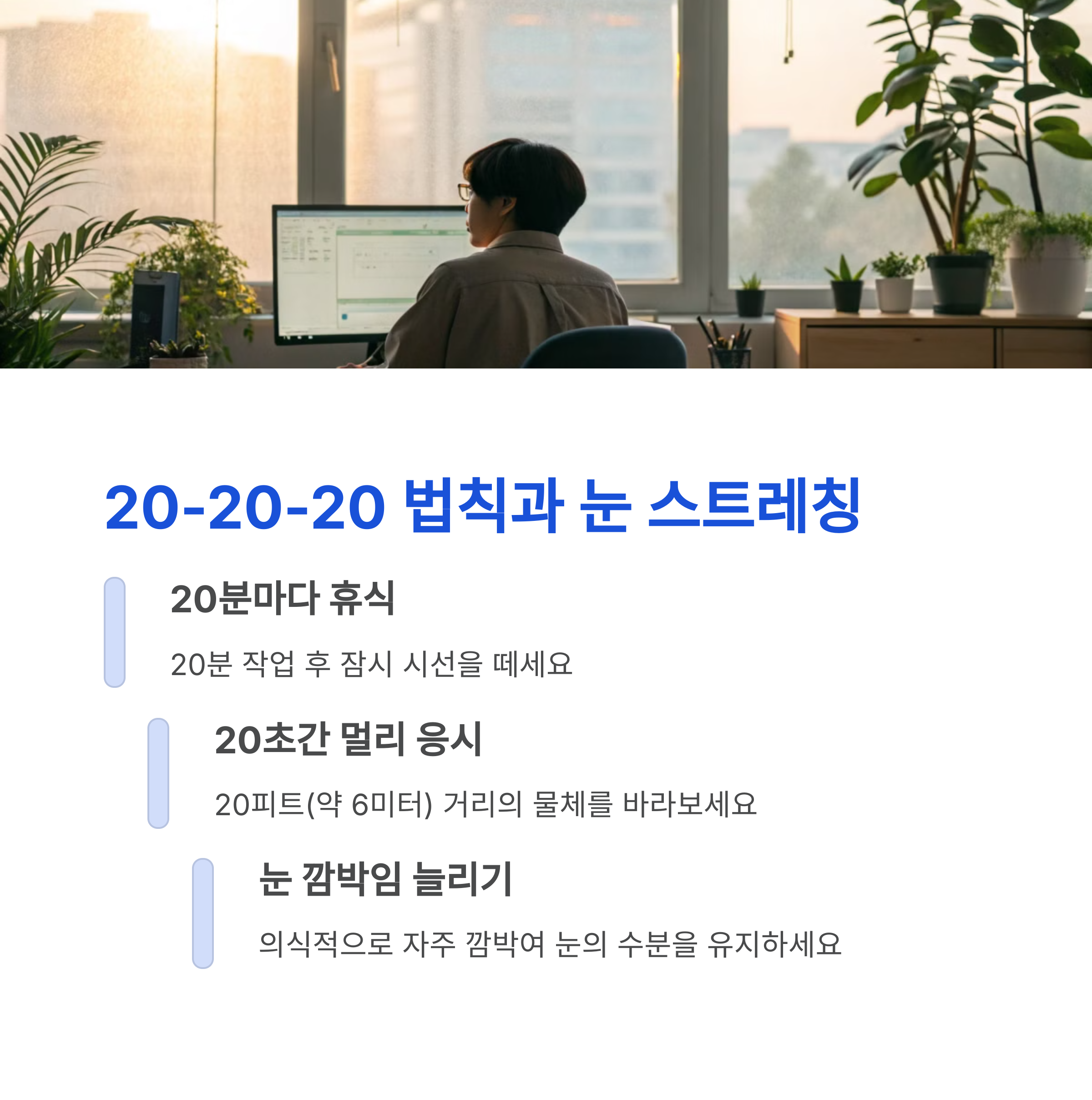 특히 저처럼 하루 종일 노트북 앞에 앉아 있는 분들에겐 필수예요. 스마트폰 알람을 20분마다 설정해 두면 자동으로 실천할 수 있어요. 회사에서도 슬쩍 먼 산 바라보는 건 누구도 뭐라 하지 않거든요 😎