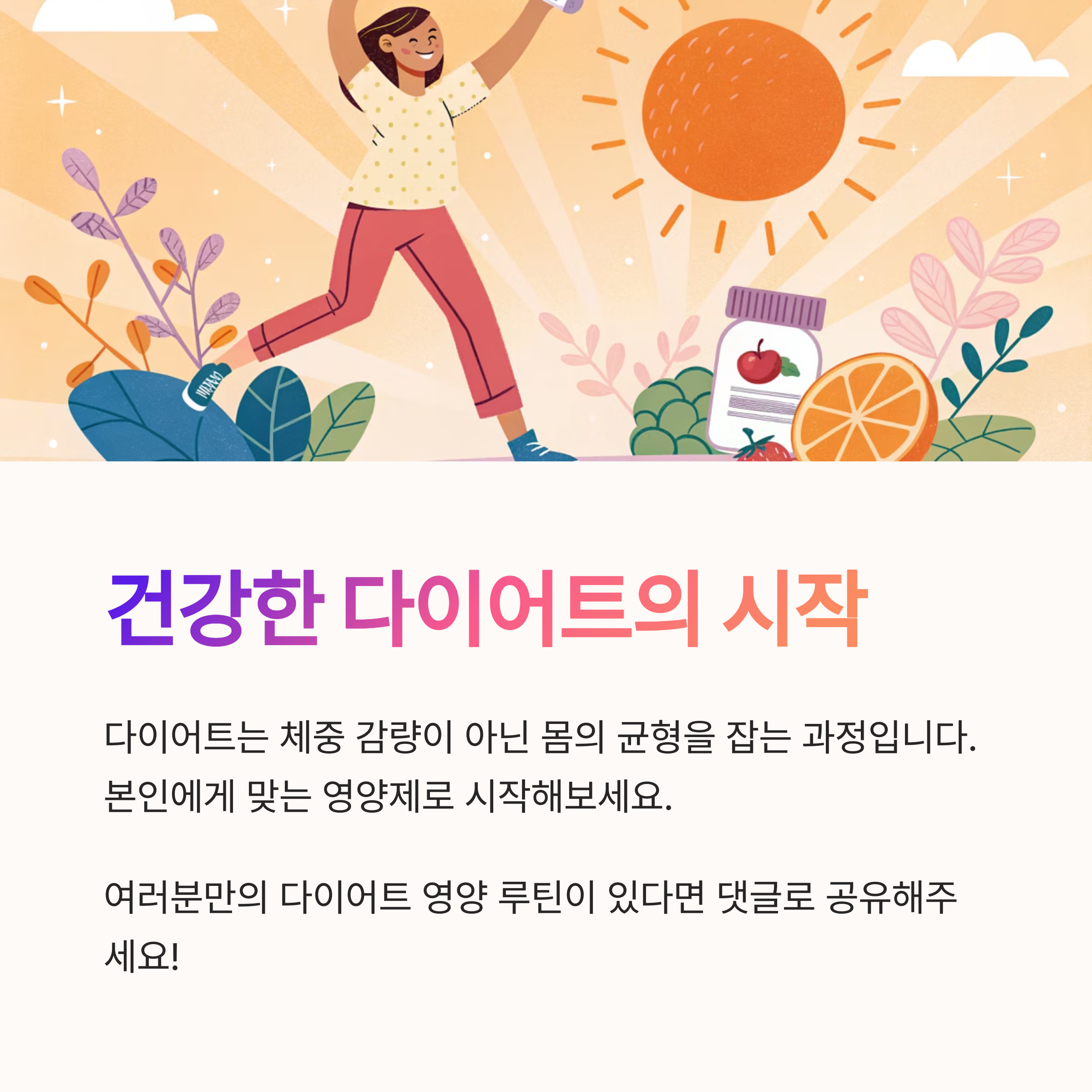 다이어트는 단순히 체중을 줄이는 행위가 아니라 몸의 균형을 다시 잡는 과정이라고 생각해요. 영양제를 잘 활용하면 그 과정이 훨씬 수월하고, 무엇보다 덜 지치게 됩니다. 저는 예전에 ‘약 먹는 느낌’이라서 꺼려했던 영양제를, 지금은 ‘에너지 충전’의 수단으로 인식하게 되었어요. 오늘 소개한 다섯 가지 조합은 꼭 다 챙기지 않아도 괜찮아요. 본인의 생활 패턴과 식습관에 맞춰 한두 가지부터 시작해 보세요. 천천히 몸이 달라지는 걸 느끼실 수 있을 거예요. 여러분도 자신만의 루틴이 있다면 댓글로 공유해 주세요. 함께 건강하게, 그리고 예쁘게 살 빼봐요!