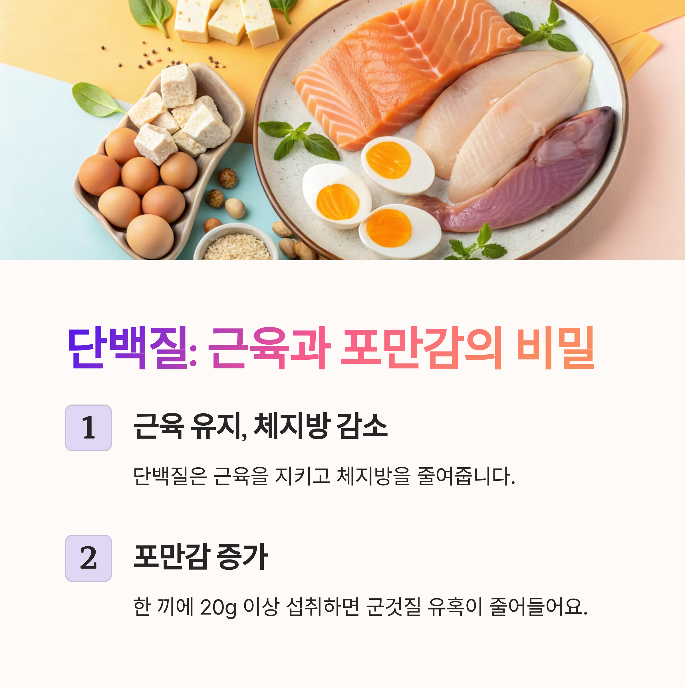 단백질은 다이어트에서 가장 먼저 떠오르는 영양소일 거예요. 그 이유는 단순합니다. 근육을 유지하고, 체지방을 줄이려면 단백질이 꼭 필요하기 때문이에요. 단백질을 충분히 섭취하면 포만감이 오래가고, 폭식이나 군것질 유혹도 줄어듭니다. 특히 근력 운동과 병행할 경우, 체지방은 줄이고 근육량은 유지할 수 있어서 체형 변화가 눈에 띄게 나타나죠.