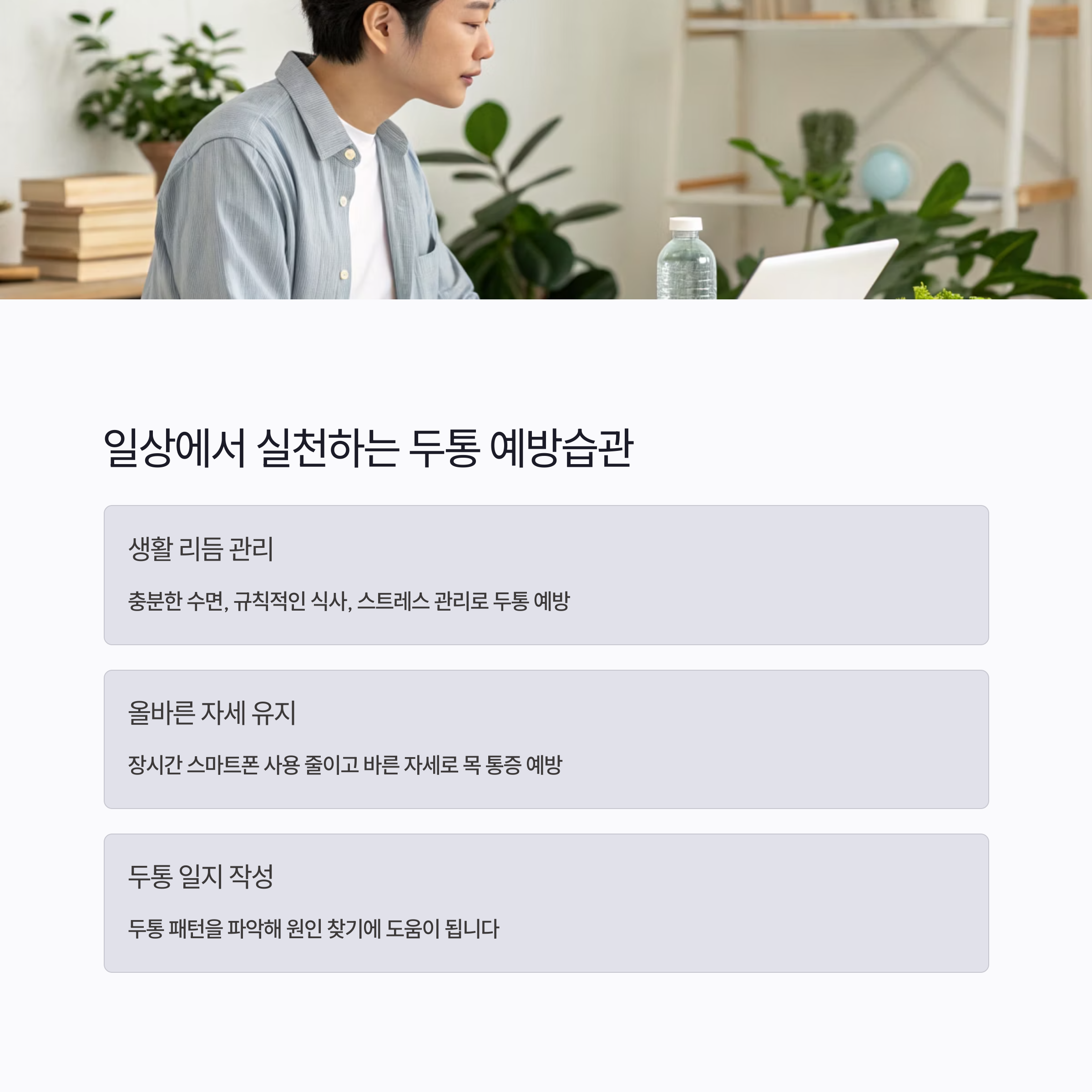 예방이 치료보다 낫죠. 생활 속 실천 가능한 방법 몇 가지만 잘 지켜도 두통이 줄어들 수 있어요.