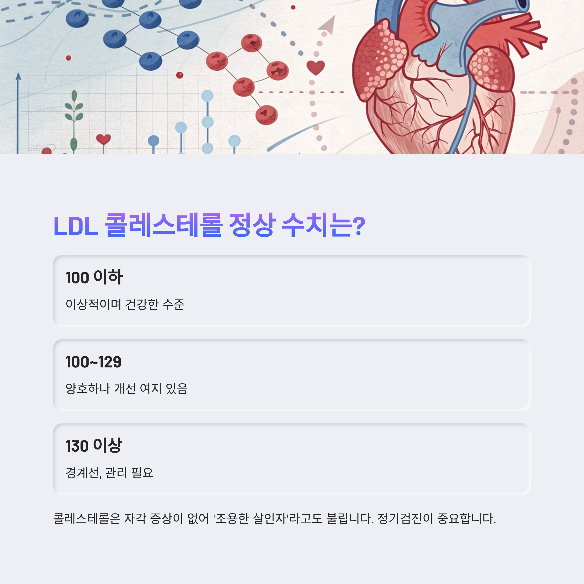 건강검진 결과에서 'LDL 콜레스테롤 수치 높음'이라는 문구를 보셨다면, 단순히 숫자 하나에 놀라지 마시고 그 이면을 꼭 들여다봐야 합니다. 콜레스테롤 수치는 단순한 숫자가 아니라 우리 혈관 건강의 상태를 알려주는 경고등 같은 존재예요.