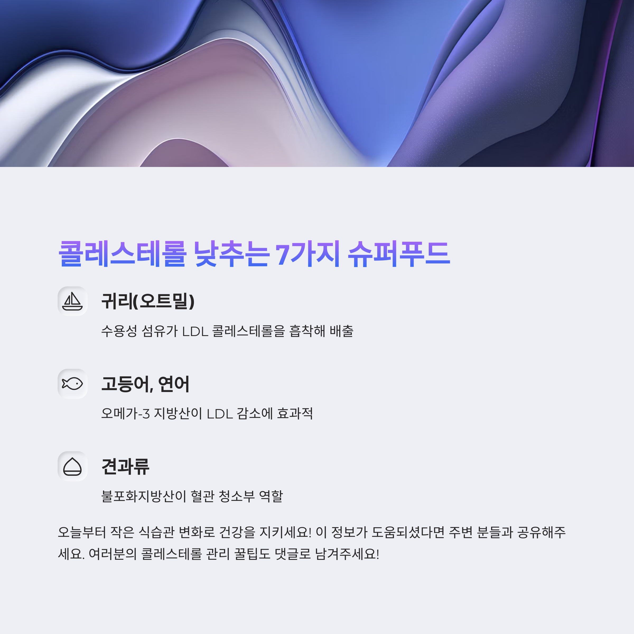오늘 소개한 내용들을 통해 LDL 콜레스테롤에 대한 이해가 조금은 깊어지셨을 거라 믿습니다. 혈관 건강은 우리 몸의 중심축이죠. 겉으로는 멀쩡해 보여도, 안에서 이미 고장이 시작되었을 수 있어요. 작은 관심이 큰 질병을 막는다는 말, 괜히 나온 게 아니더라고요. 오늘부터라도 귀리 한 숟갈 더 올리고, 엘리베이터 대신 계단 한 칸 더 올라보는 건 어떠세요? 작지만 꾸준한 변화가 건강을 바꾸는 시작입니다. 이 글이 조금이나마 도움이 되셨다면, 주변 분들과 함께 공유해 주세요. 댓글로 여러분의 콜레스테롤 관리 꿀팁도 기다릴게요!