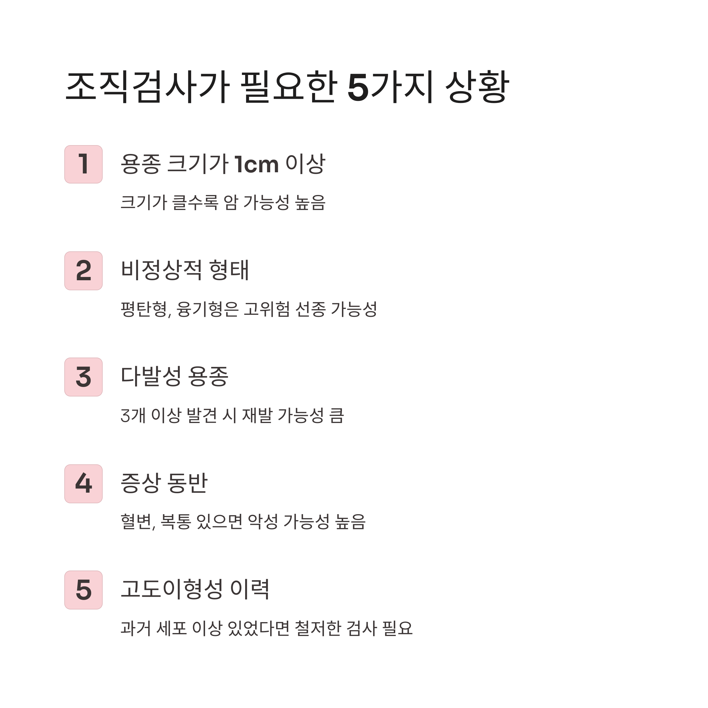 이 글에서는 용종 제거 후 꼭 조직검사가 필요한 5가지 상황과 함께,