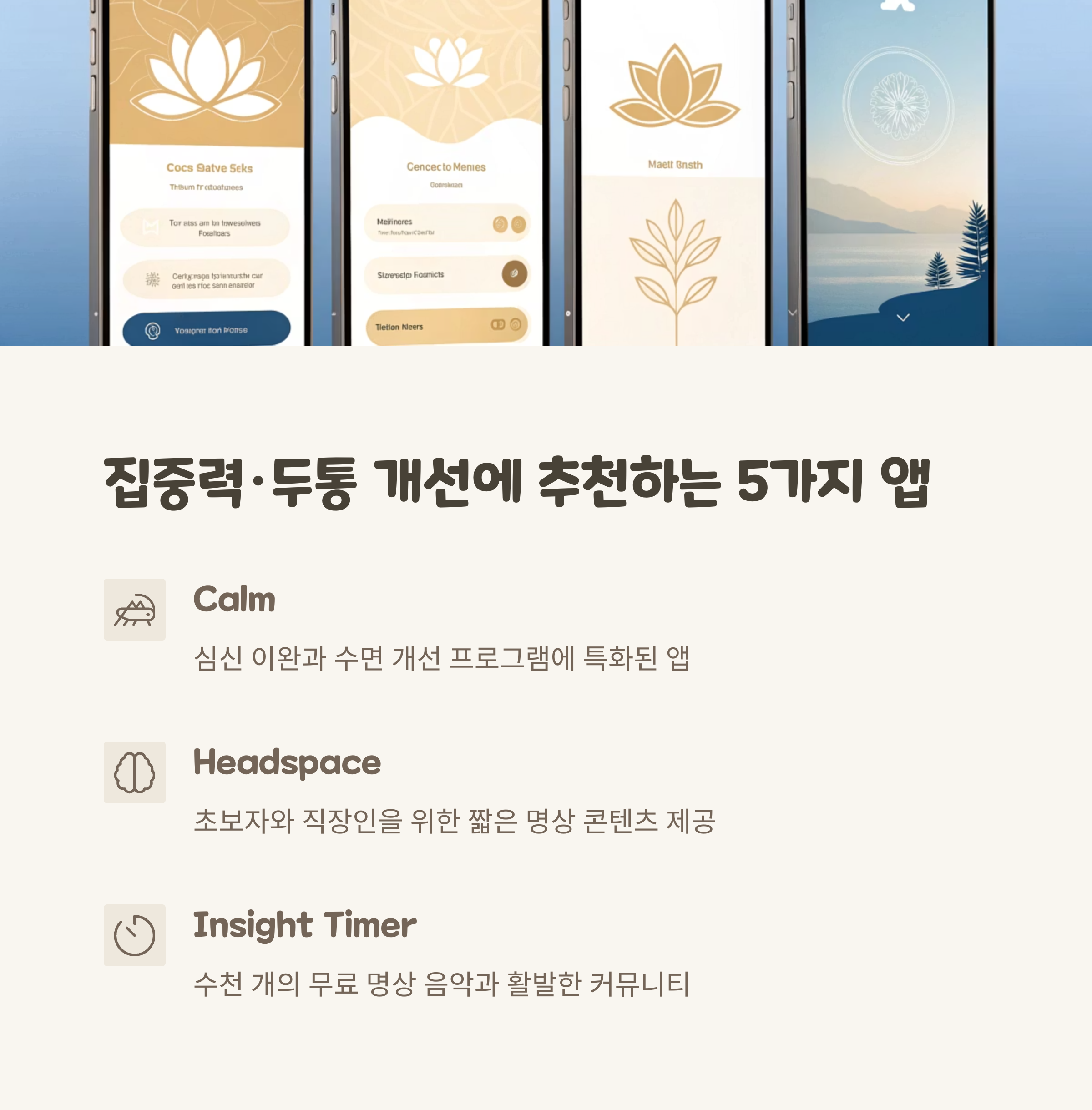 안녕하세요, 여러분! 요즘처럼 스트레스가 쌓이는 날씨에 저도 자주 머리가 띵하고 집중이 안 될 때가 많아요. 예전엔 그냥 참고 넘겼는데, 어느 순간 이게 일상생활에까지 영향을 미친다는 걸 깨닫고 나서야 진지하게 방법을 찾기 시작했어요. 그 과정에서 만난 게 바로 명상 앱들이었어요. 짧게는 5분, 길게는 10분 정도만 투자해도 머리가 맑아지고 심지어 기분까지 좋아지는 경험을 하게 됐죠. 오늘은 제가 직접 써보고 효과를 느낀 명상 앱 5가지를 소개하면서, 두통 완화와 집중력 강화라는 두 마리 토끼를 동시에 잡는 방법을 풀어보려 합니다. 가볍게 따라와 주세요!