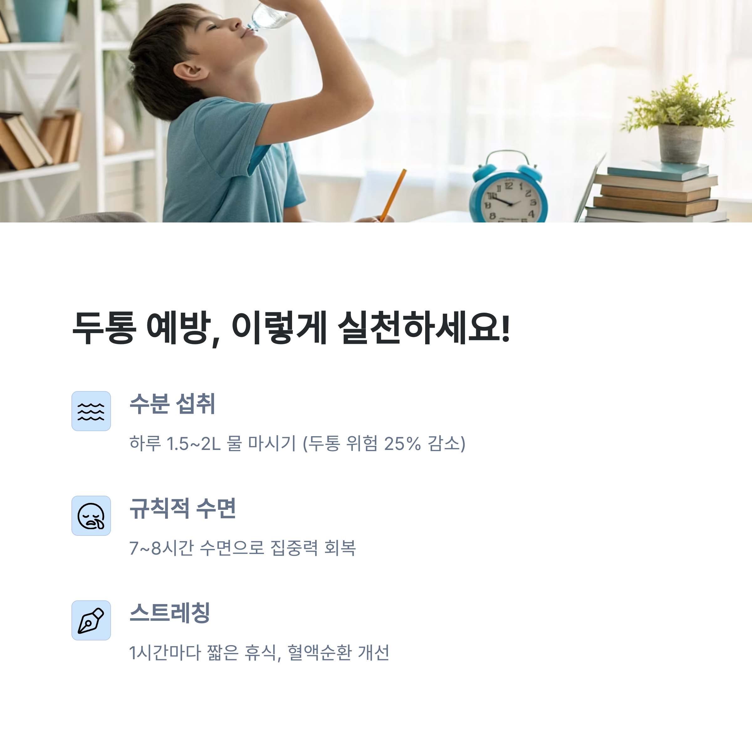 두통을 예방하고 집중력을 끌어올리려면 일상 속 작은 습관부터 점검해야 합니다. 사실 거창한 변화가 필요한 게 아니라, 꾸준히 실천 가능한 기본을 지키는 게 핵심이에요.