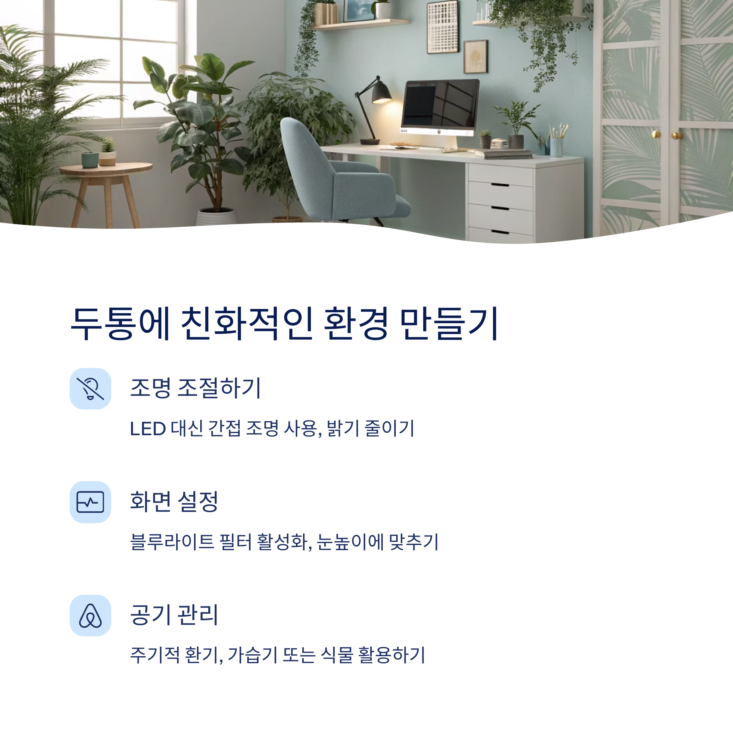 | 공기 | 주기적 환기, 가습기 또는 식물 활용 |