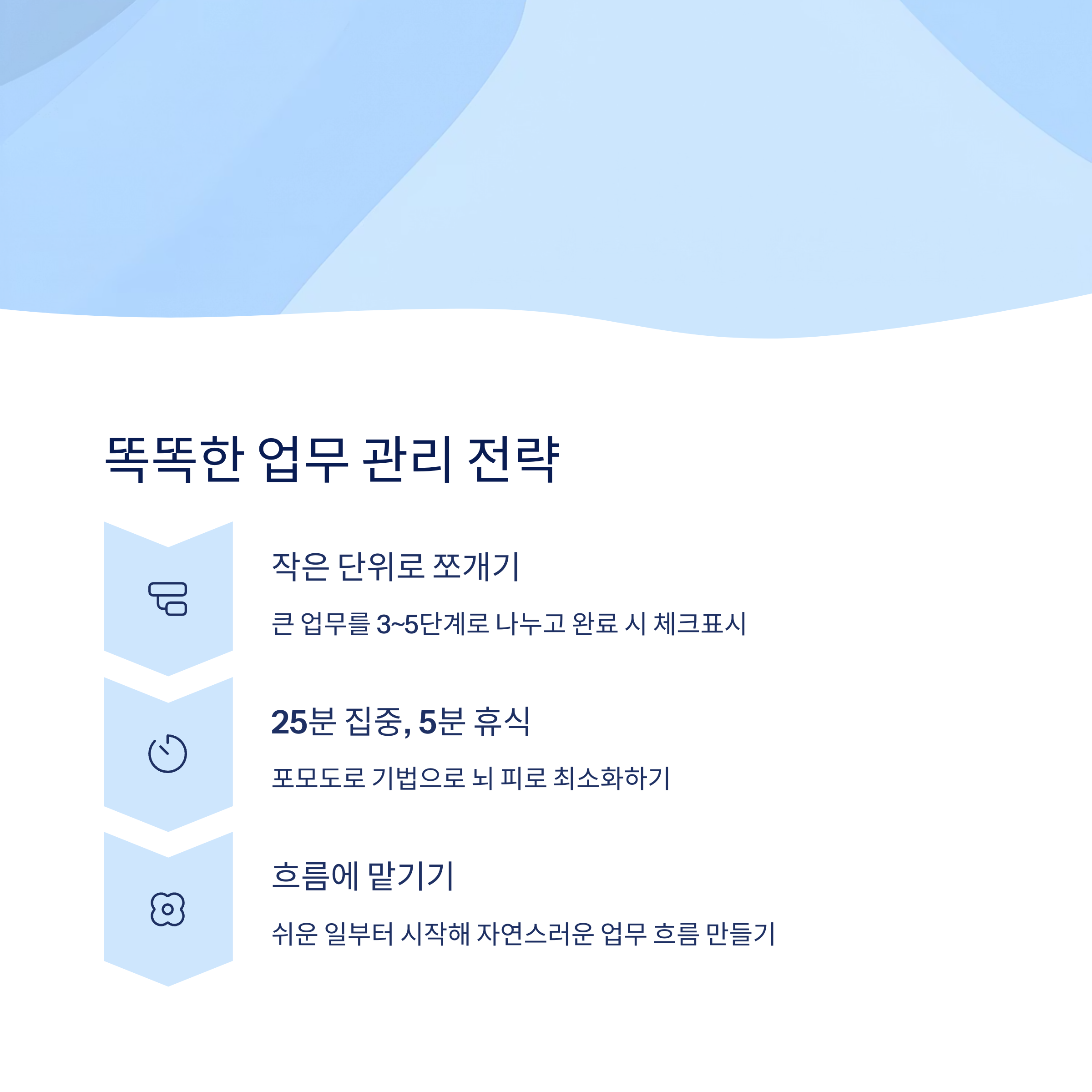 완벽한 집중보다 ‘흐름 유지’가 중요합니다. 작은 일부터 시작해 보세요. 흐름을 타면 자연스럽게 업무 속도가 붙을 수 있어요.