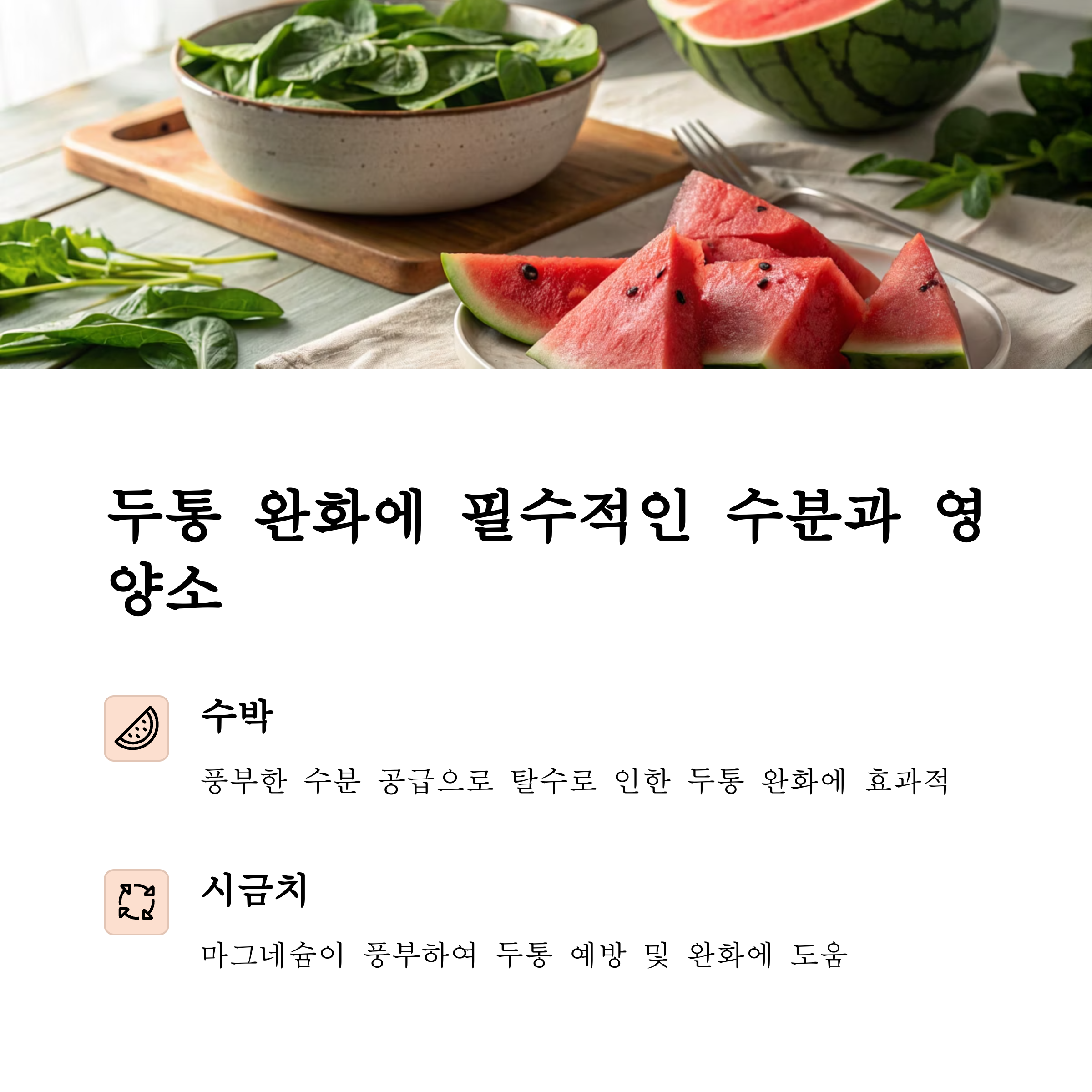 수박, 오렌지, 시금치, 연어 등 수분과 마그네슘, 오메가-3가 풍부한 음식이 두통 완화에 가장 효과적입니다.