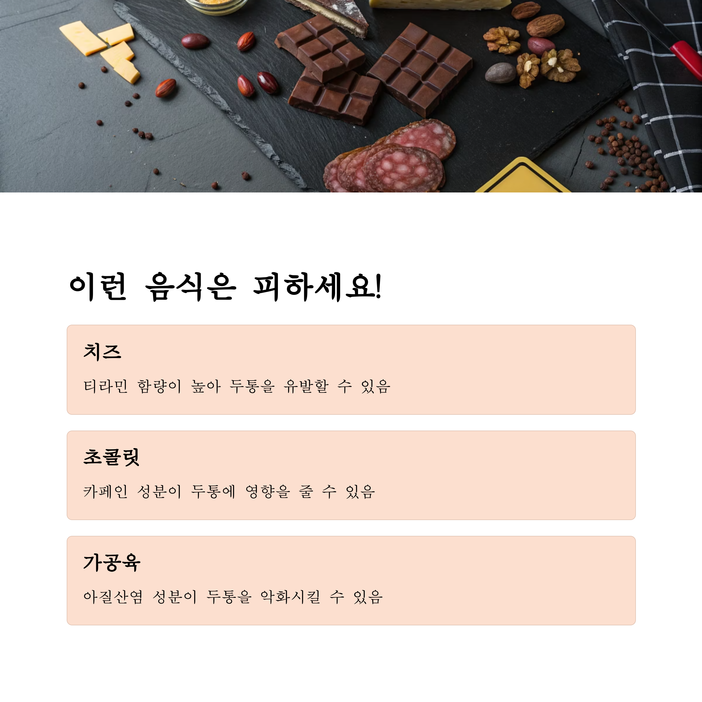 두통을 예방하려면 도움이 되는 음식만큼 피해야 할 음식도 중요합니다. 우리 몸은 아주 예민해서 특정 성분에 과민반응을 보이기도 합니다. 아래 리스트를 참고해서 일상 속에서 체크해 보세요.