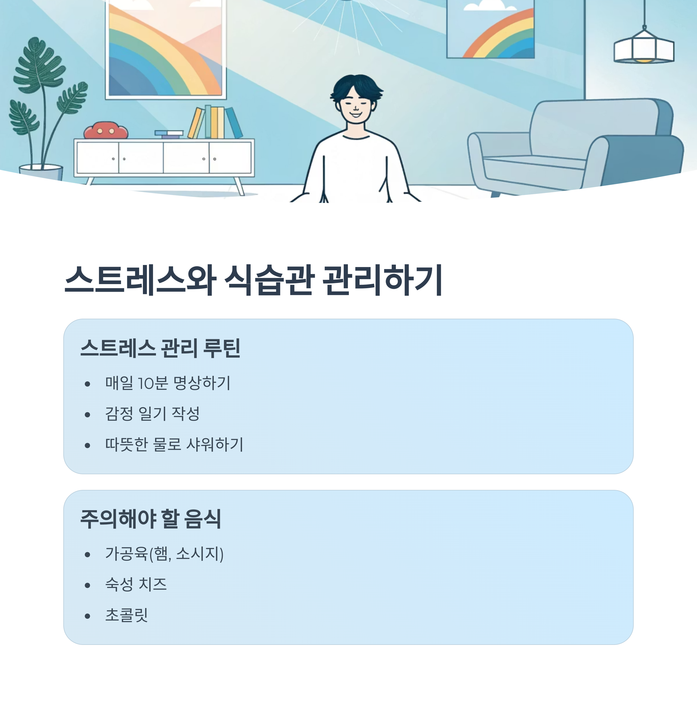 | 취침·기상 시간 고정 | 생체리듬 유지로 두통 예방 |
