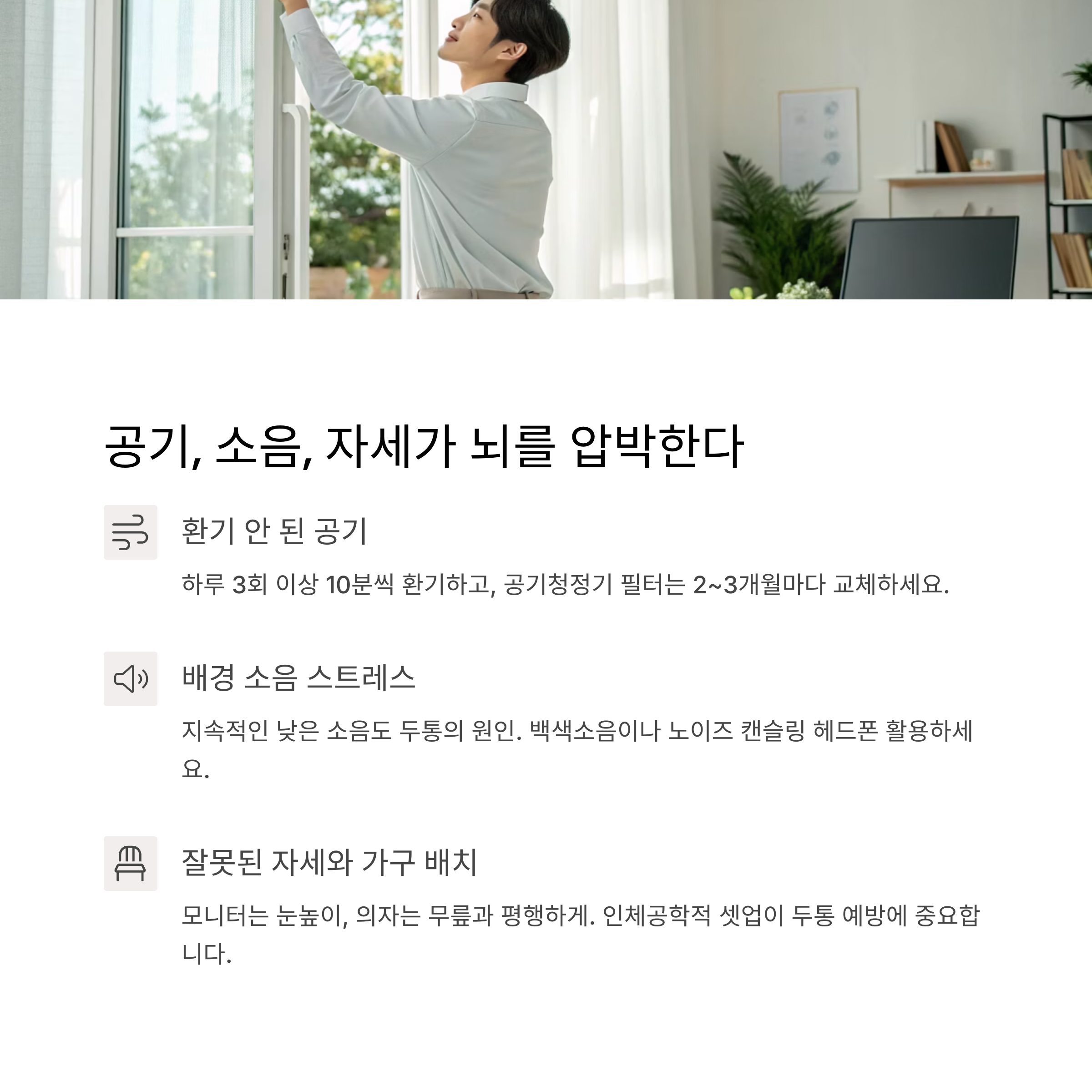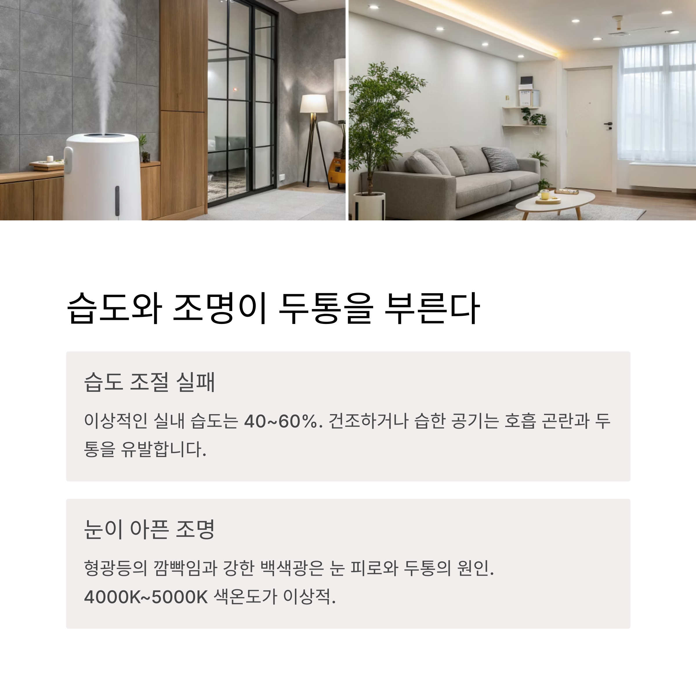 이처럼 작은 환경적 요소 하나하나가 누적되어 두통으로 나타납니다. 원인을 모를 두통이라면, 지금 당장 내가 있는 공간부터 점검해 보는 것이 필요하겠죠?