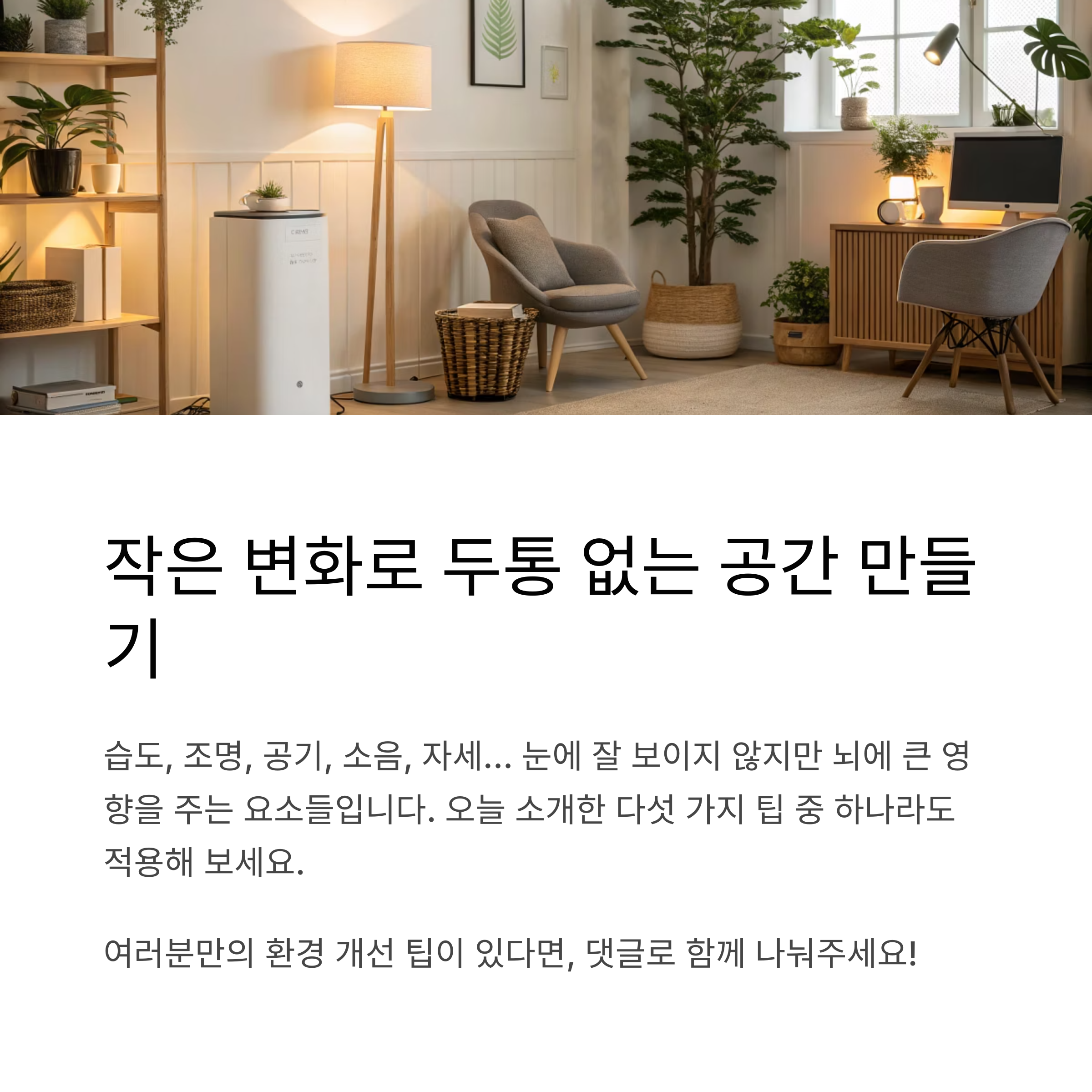 두통은 복잡하고 다양한 원인을 가질 수 있지만, 우리가 매일 머무는 공간이 그 출발점이 될 수도 있다는 사실, 오늘 새삼 느끼셨을 겁니다. 습도, 조명, 공기, 소음, 자세... 모두 눈에 잘 보이지 않지만 뇌에 큰 영향을 주는 요소들이에요. 단 하나만 바꿔도 두통의 빈도가 눈에 띄게 줄 수 있다는 걸 직접 경험한 사람으로서 말씀드립니다. 오늘 소개한 다섯 가지 팁 중 하나라도 적용해 보시고, 나만의 두통 없는 공간을 만들어보세요. 그리고 혹시 여러분만의 환경 개선 팁이 있다면, 댓글로 함께 나눠주세요!
