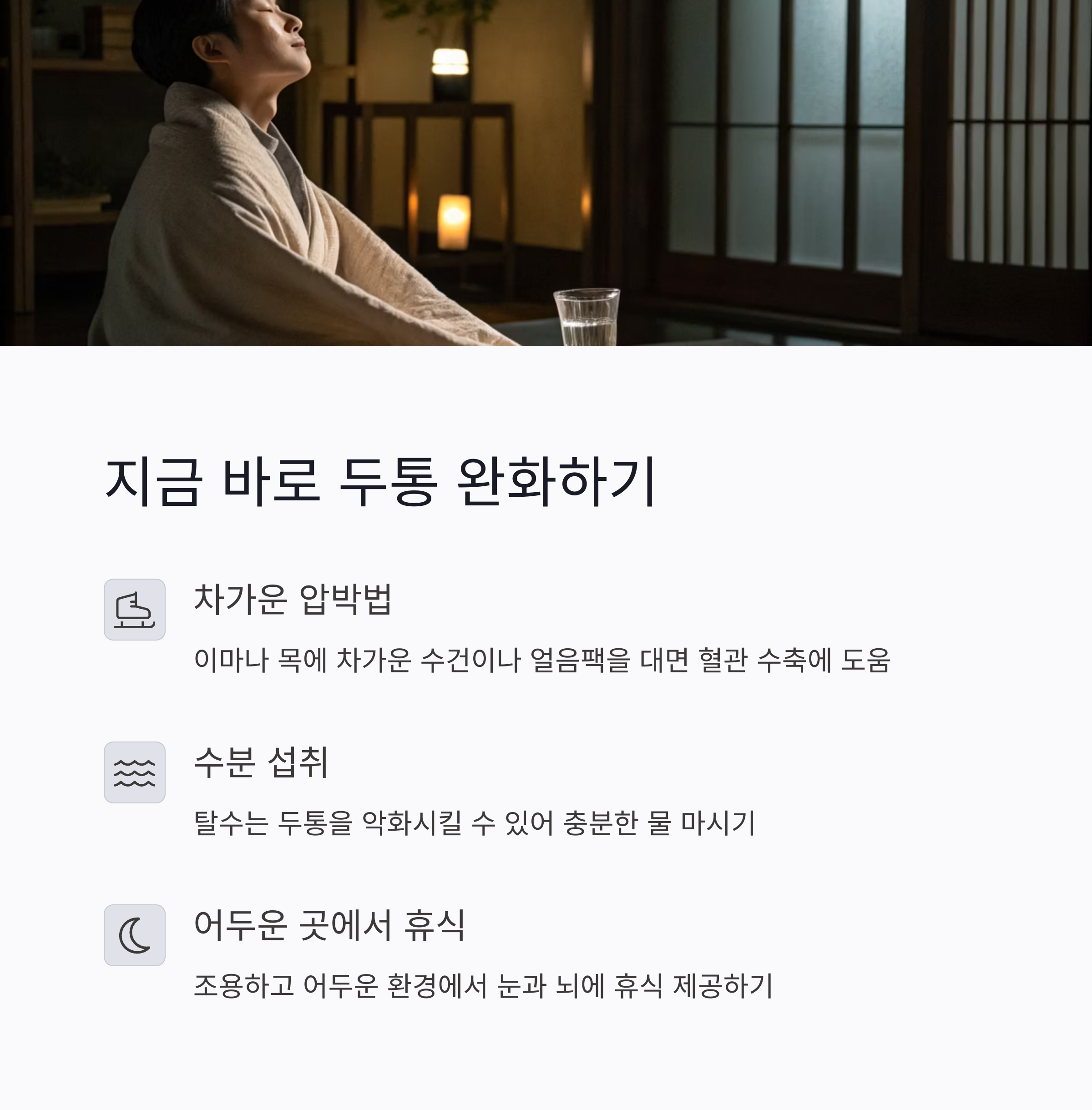 | 아이싱 (차가운 물수건, 아이스팩) | 혈관 수축을 도와 두통 완화 | 이마, 목 뒤, 관자놀이 |