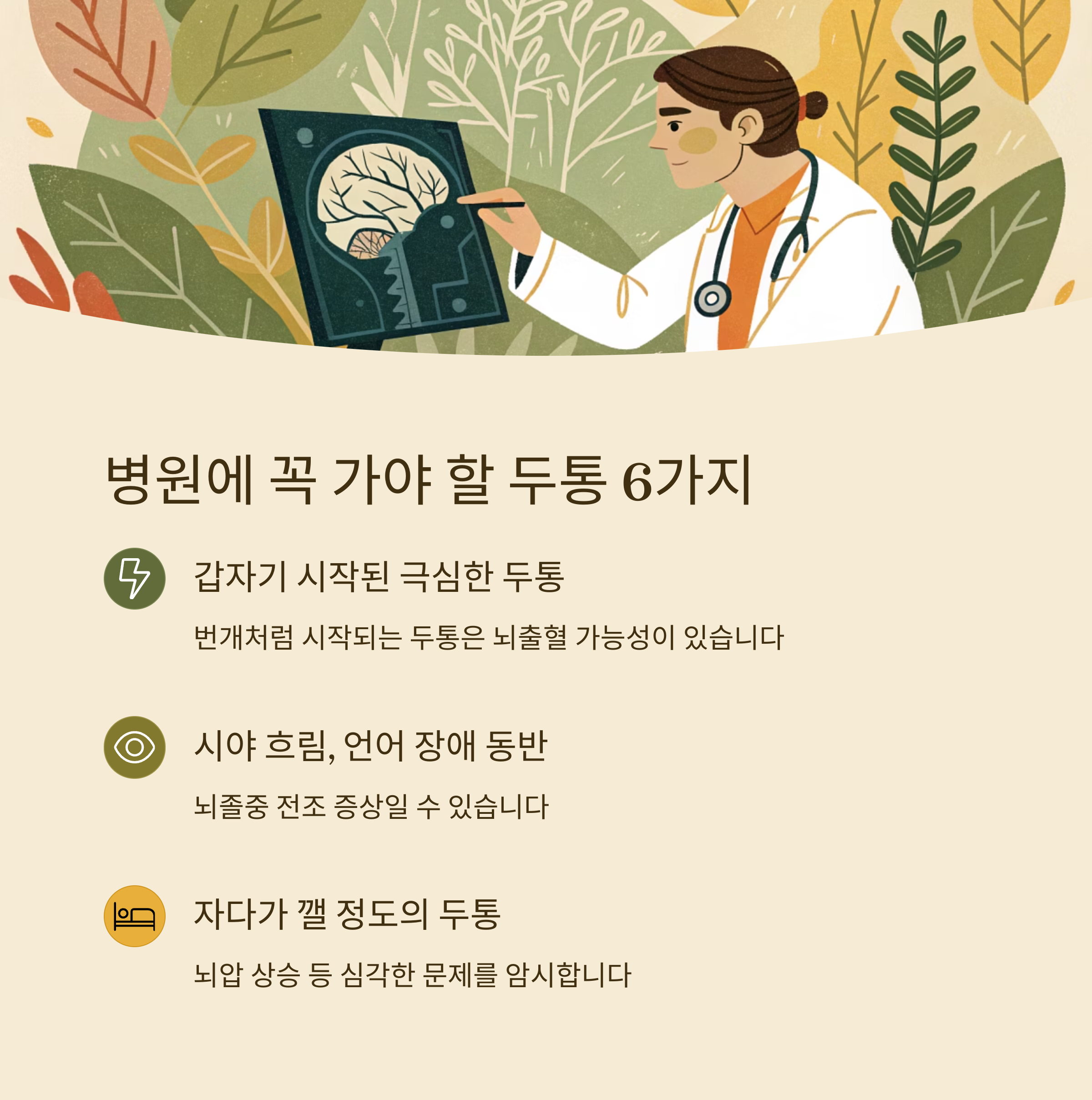 | 신경학적 증상이 동반된 두통 | 팔이나 다리의 마비, 감각 이상 등은 즉시 응급실 방문이 권장됩니다. |