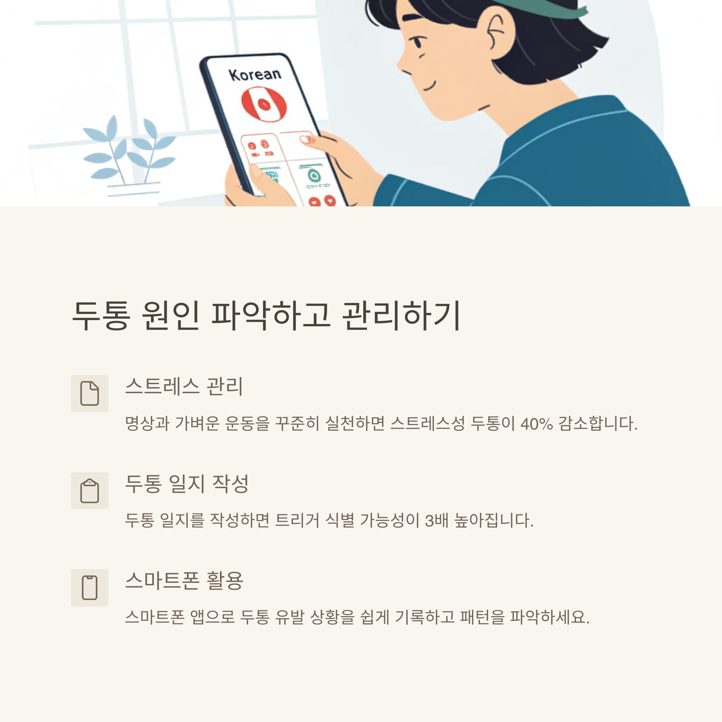 두통의 원인은 사람마다 다르고, 똑같은 상황에서도 어떤 날은 괜찮고 어떤 날은 아플 수 있어요. 그래서 두통 일기가 중요합니다. 언제, 어떤 상황에서 두통이 생겼는지 기록하면 반복되는 패턴을 발견할 수 있어요. 그걸 피하는 것만으로도 절반은 예방에 성공한 거나 다름없답니다.