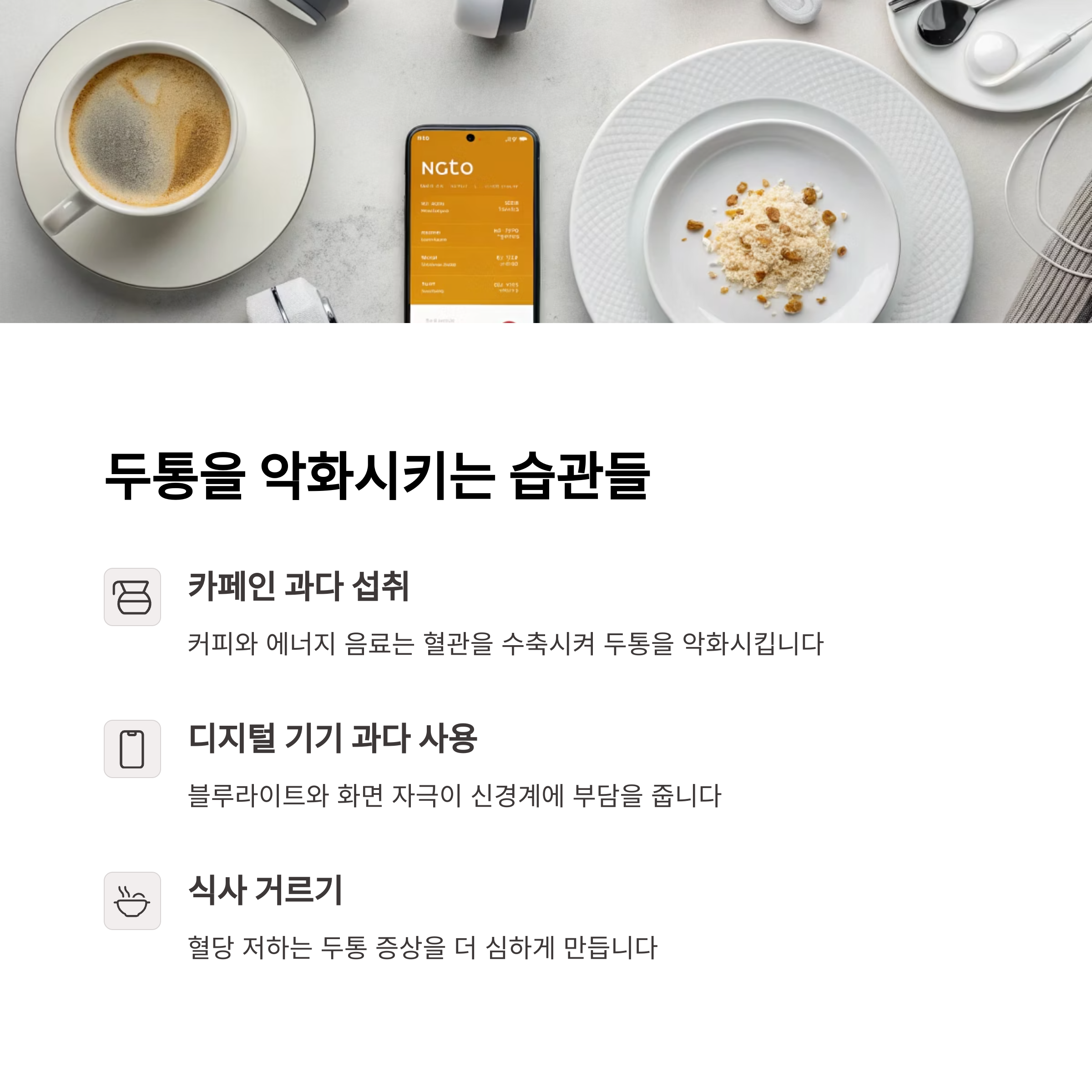 안녕하세요, 여러분! 혹시 두통이 심한 날, 습관적으로 커피를 더 마시거나 휴대폰을 오래 들여다본 적 있으신가요? 저도 과거엔 그랬어요. 그런데 알고 보니 이런 행동들이 두통을 더 악화시킬 수 있다는 사실! 그래서 오늘은 두통이 있을 때 절대 해서는 안 되는 행동 5가지와 그에 대한 대처법까지 친절하고 쉽게 풀어드릴게요. 두통을 더 악화시키지 않고 빠르게 회복하는 방법, 지금부터 함께 알아봐요!