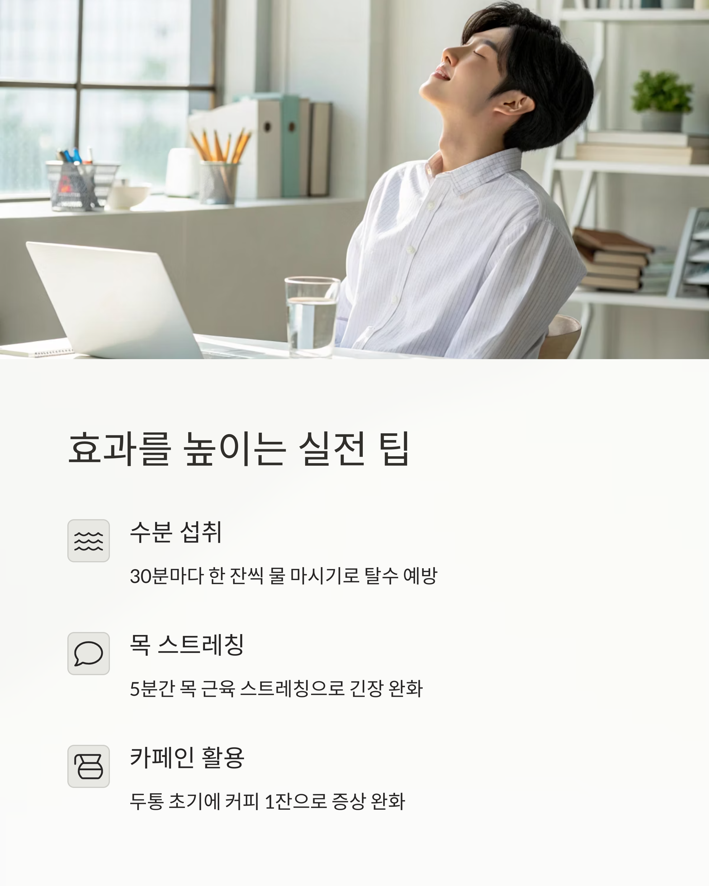 | 긴장성 + 편두통 혼합 | 온찜질 후 냉찜질 번갈아 사용 |