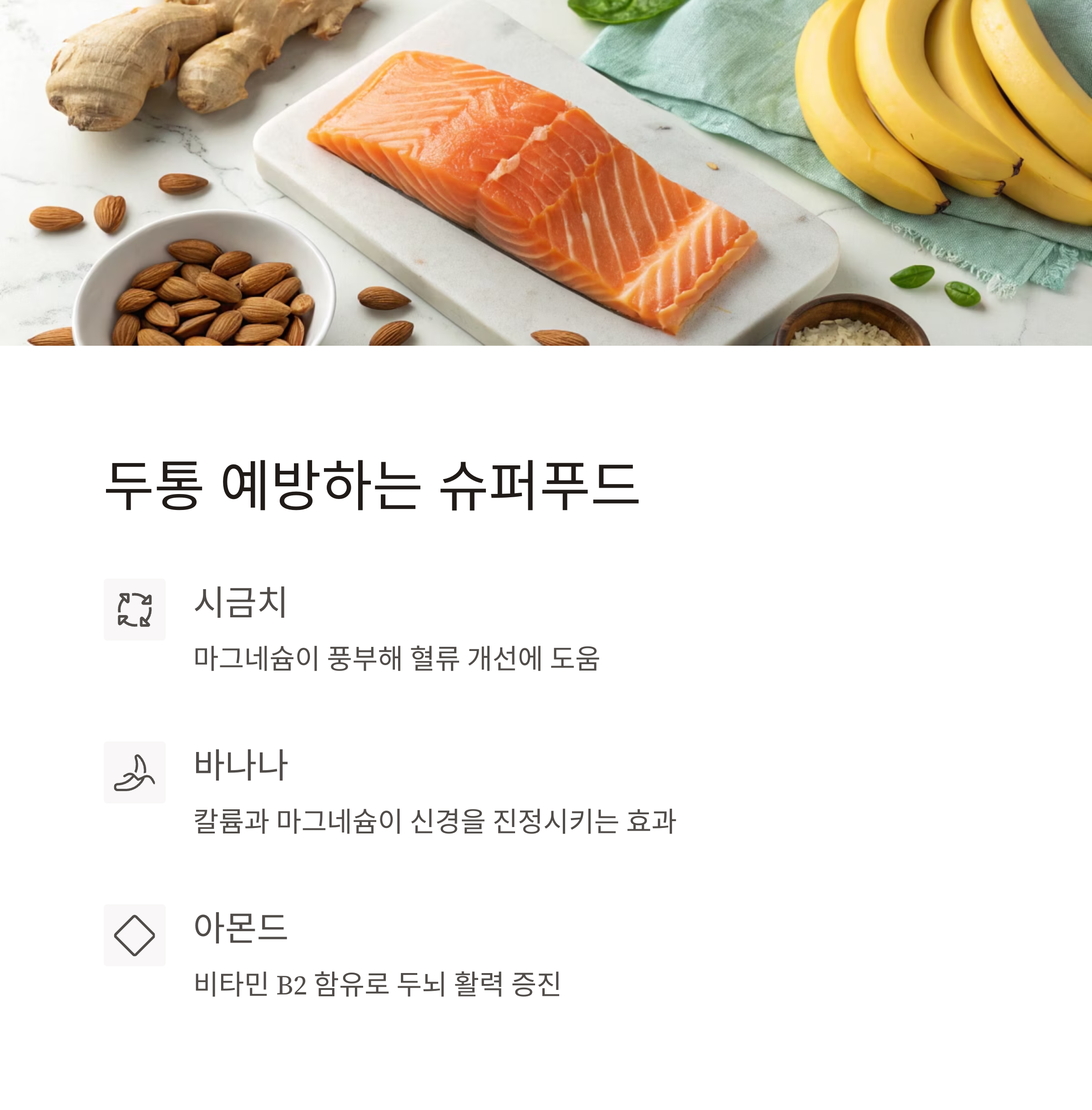 안녕하세요! 두통은 일상에 큰 불편을 주는 증상 중 하나인데요, 약에 의존하기보다는 식단을 통해 근본적인 체질 개선을 시도해보는 건 어떨까요? 두통을 유발하지 않으면서 오히려 뇌와 신경을 안정시키는 식재료들을 조합하면 두통 예방에 큰 도움이 됩니다. 이번 포스팅에서는 맛있고 건강하게 실천할 수 있는 식단 가이드를 제안드릴게요.