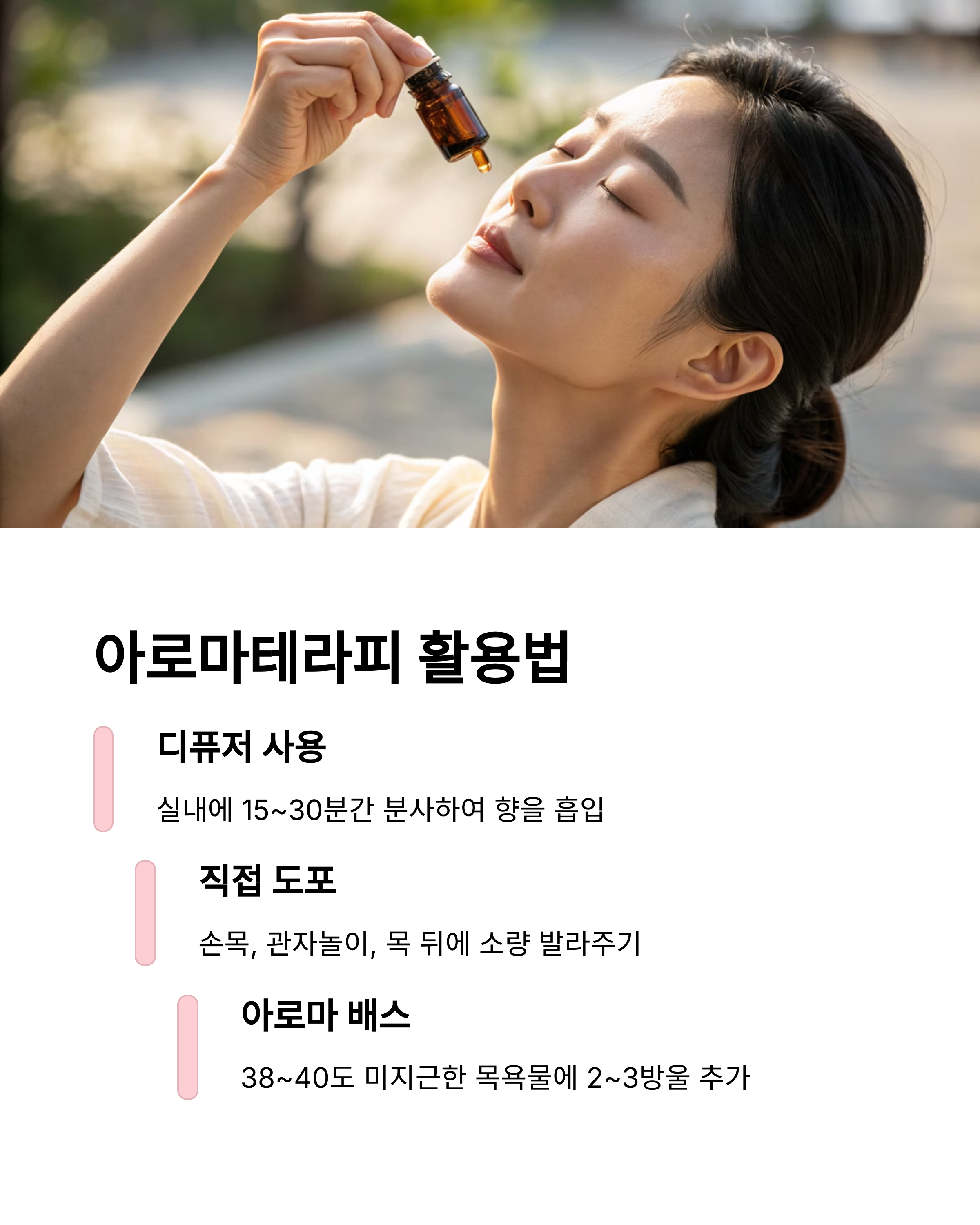 | 라벤더 | 신경 안정, 수면 유도 | 베개에 한 방울 떨어뜨리기 |