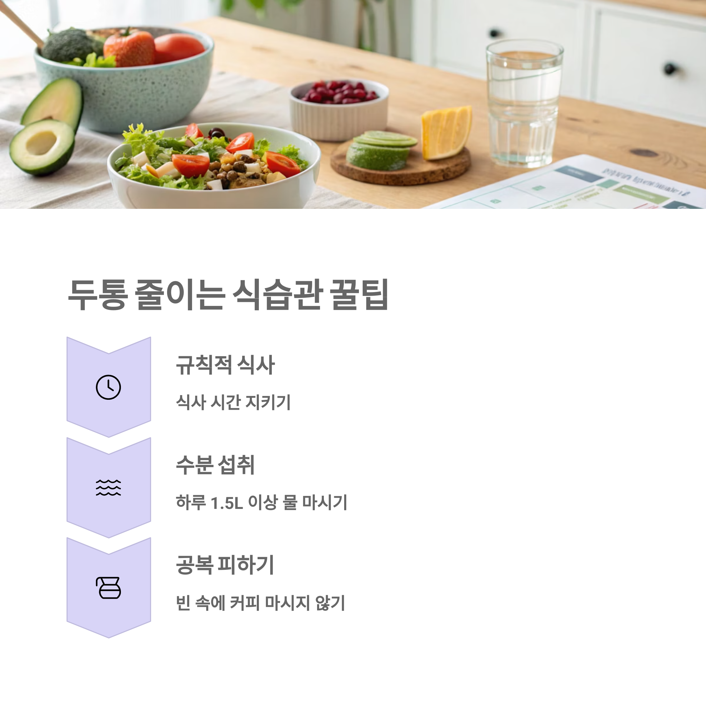 단순히 음식만 조심한다고 두통이 사라지진 않죠. 그래서 일상에서 실천할 수 있는 작은 팁들을 정리해 봤어요. 요건 제가 직접 해보고 효과 있었던 것들이라 강추입니다!