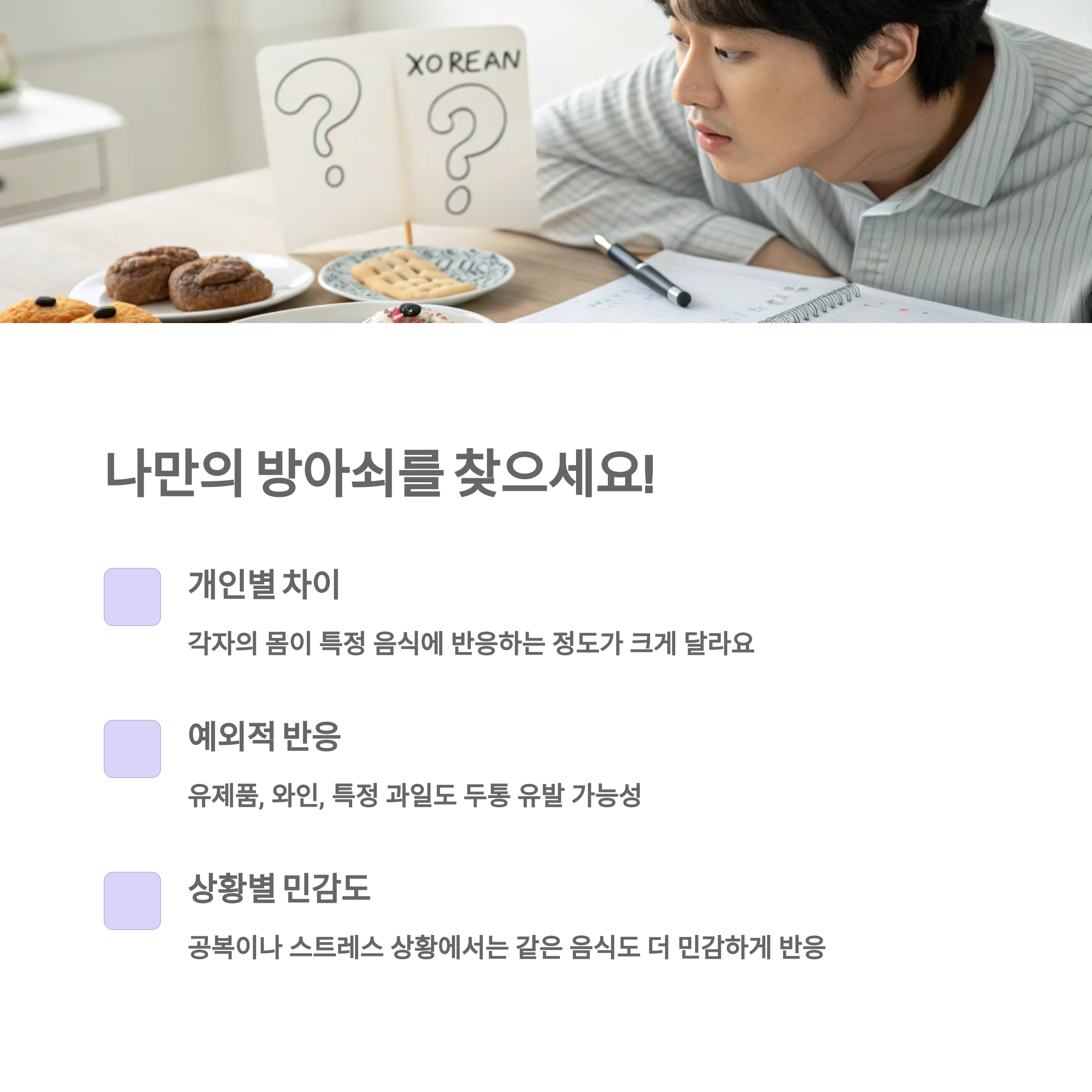 개인마다 체질과 민감도가 달라서 같은 음식을 먹어도 반응은 다를 수 있어요. 나에게 맞는 패턴을 파악하는 게 핵심이에요.