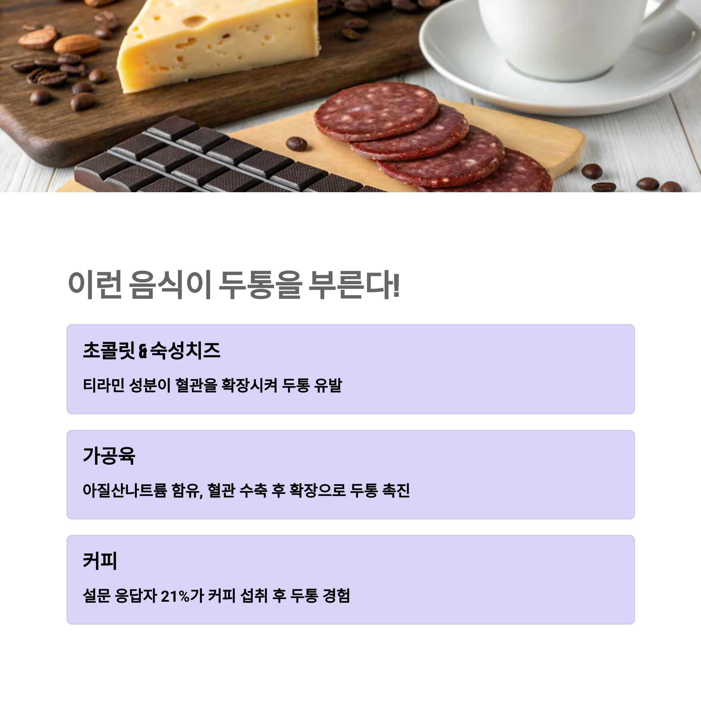 갑자기 머리가 지끈거릴 때, 약부터 찾기 전에 그날 먹었던 음식들을 먼저 떠올려 보세요. 특히 아래 음식들은 두통이 심할 때 유력한 '용의자'입니다. 어떤 날엔 괜찮고, 어떤 날엔 안 괜찮을 수도 있으니 반복적으로 나타나는 패턴이 있다면 의심해 볼 필요가 있어요.