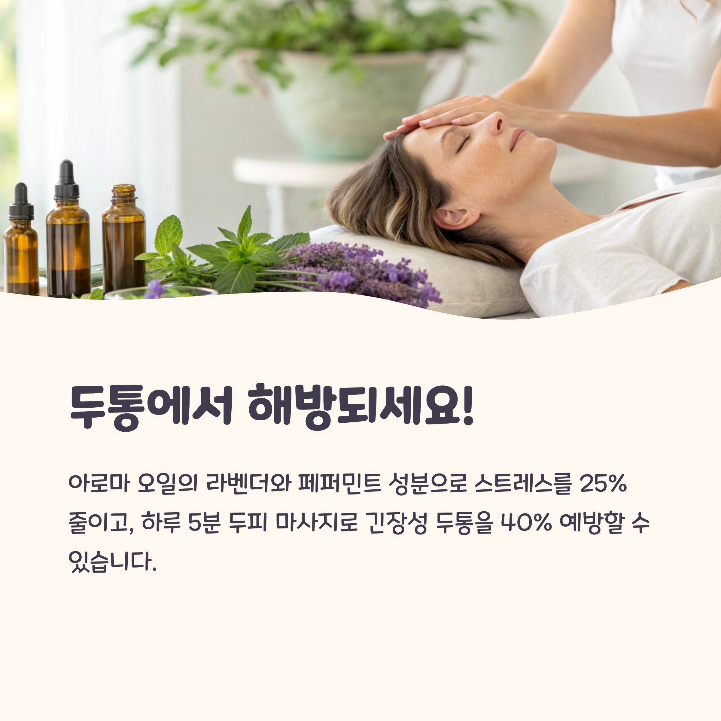 스트레스성 두통이라면 아로마 테라피가 꽤 효과적이에요. 특히 페퍼민트, 라벤더 오일은 신경을 진정시키고 통증을 완화하는 데 탁월합니다. 디퓨저를 이용해 방 안에 퍼뜨리거나, 관자놀이에 소량 바르는 것도 좋아요.