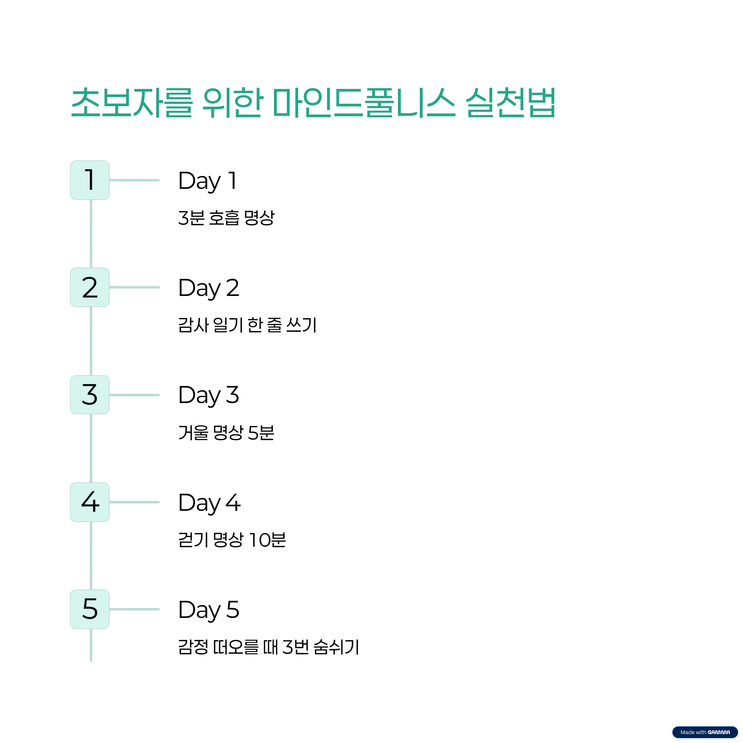 - 하루 5분, 조용한 공간에서 눈을 감고 들숨과 날숨에 집중하세요.