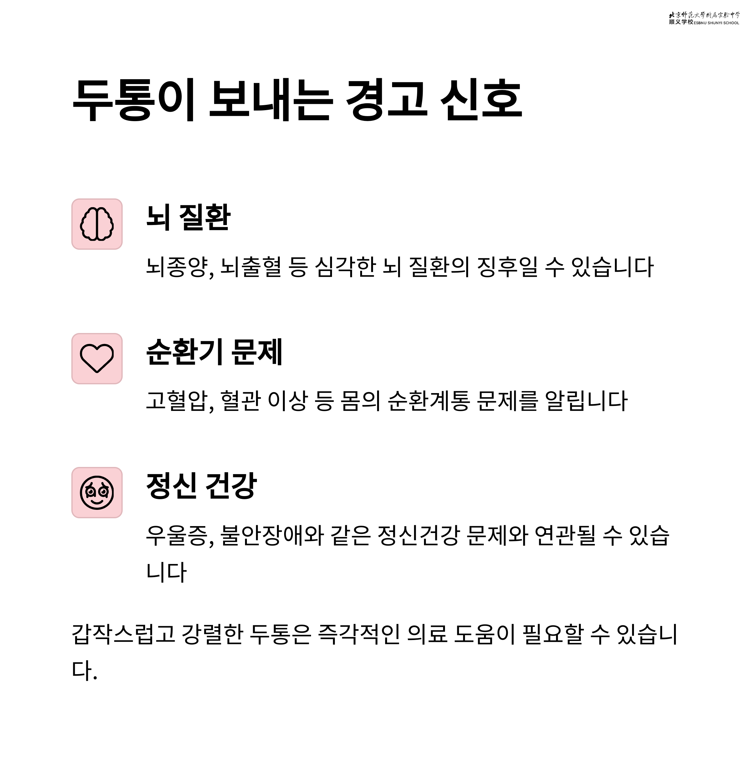 | 뇌혈관 질환 | 갑작스럽고 극심한 통증 | 의식 저하, 언어장애 |