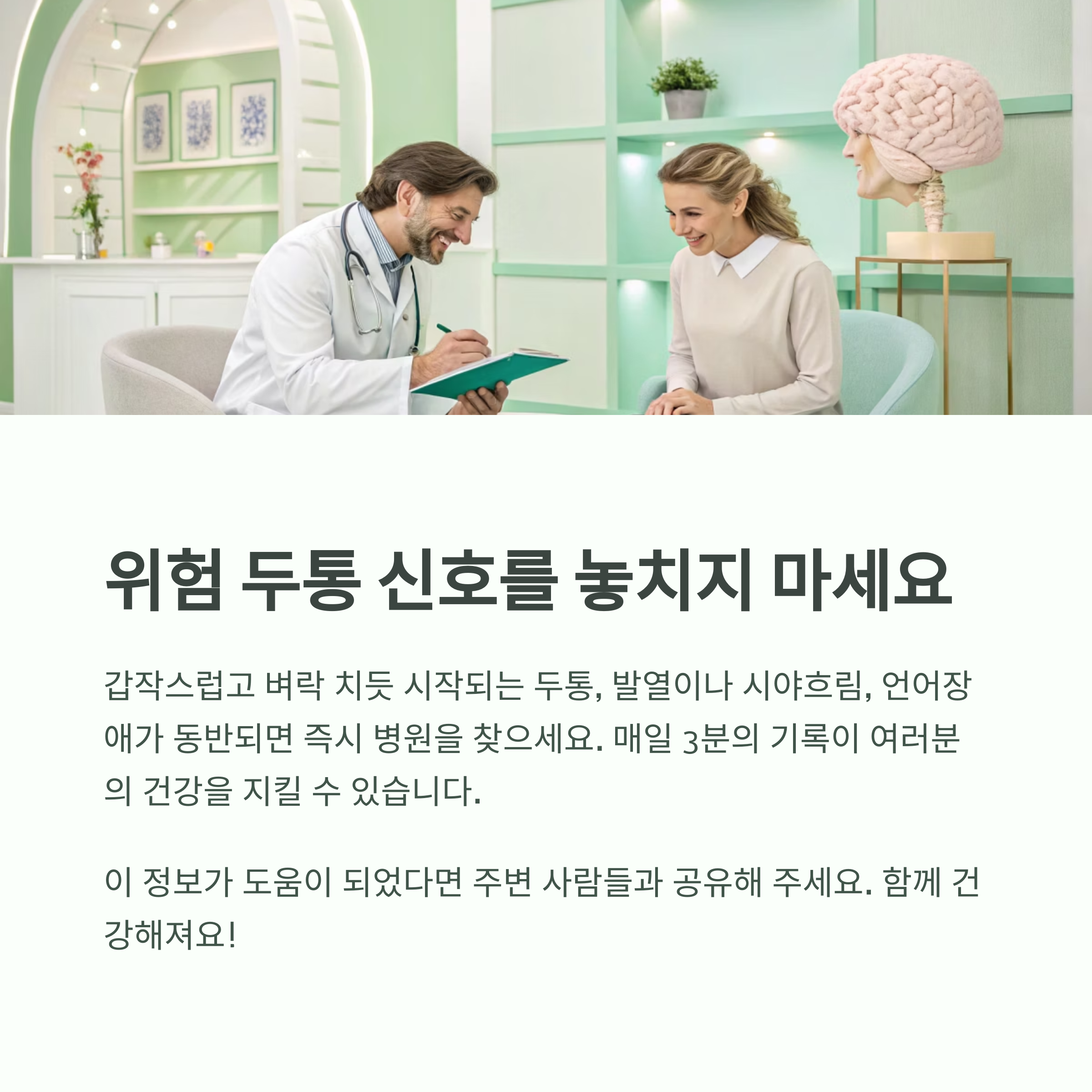 두통, 그냥 넘기고 계셨나요? 매일 3분만 투자하면 위중한 신호를 미리 감지할 수 있어요.