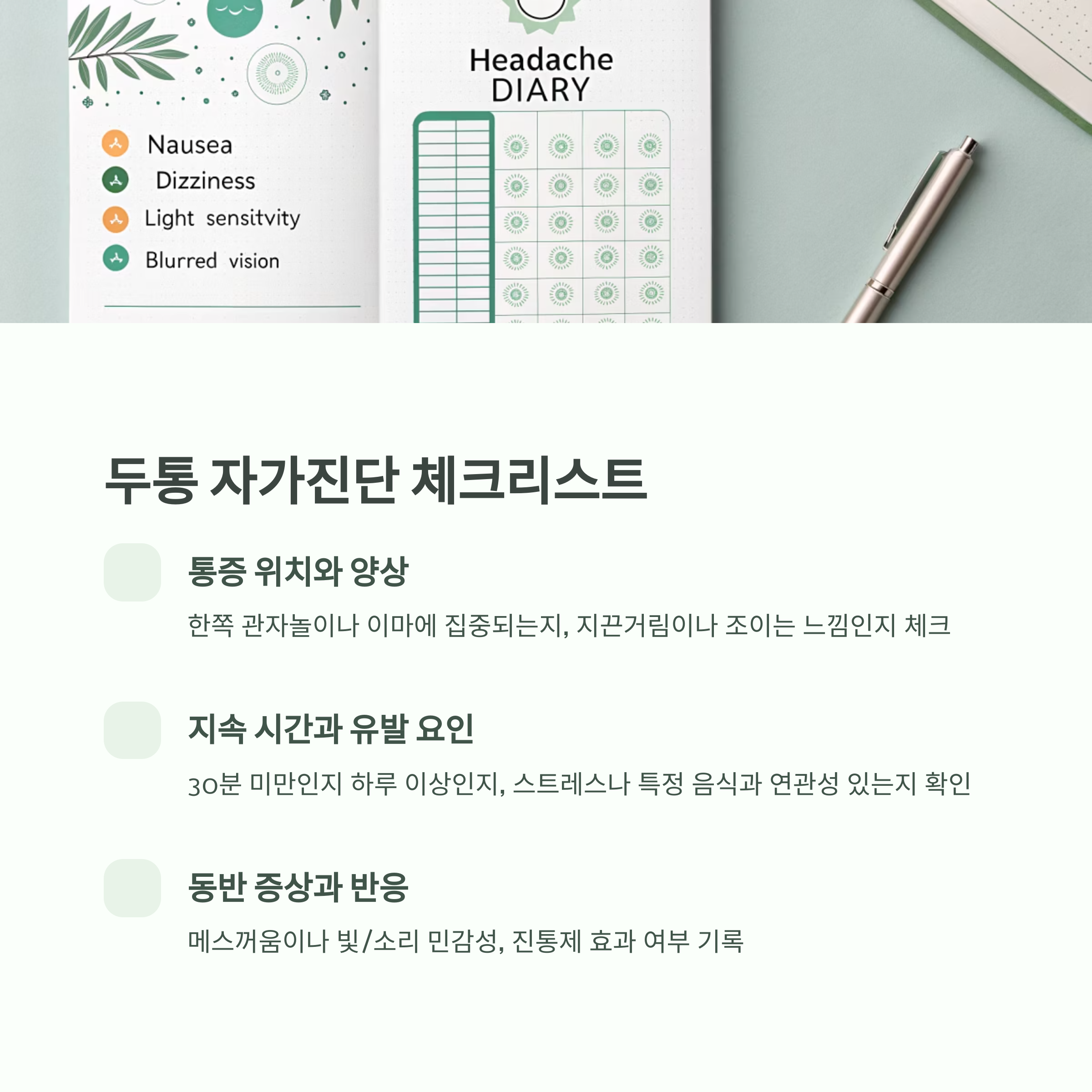 특히 반복되는 두통이 있다면 ‘언제, 어떤 상황에서 두통이 시작되었는지’를 확인하는 것만으로도 병원 진료 시 중요한 자료가 될 수 있어요. 실제로 신경과에서는 두통 일지와 체크리스트를 진단 보조도구로 활용하기도 하니까요.