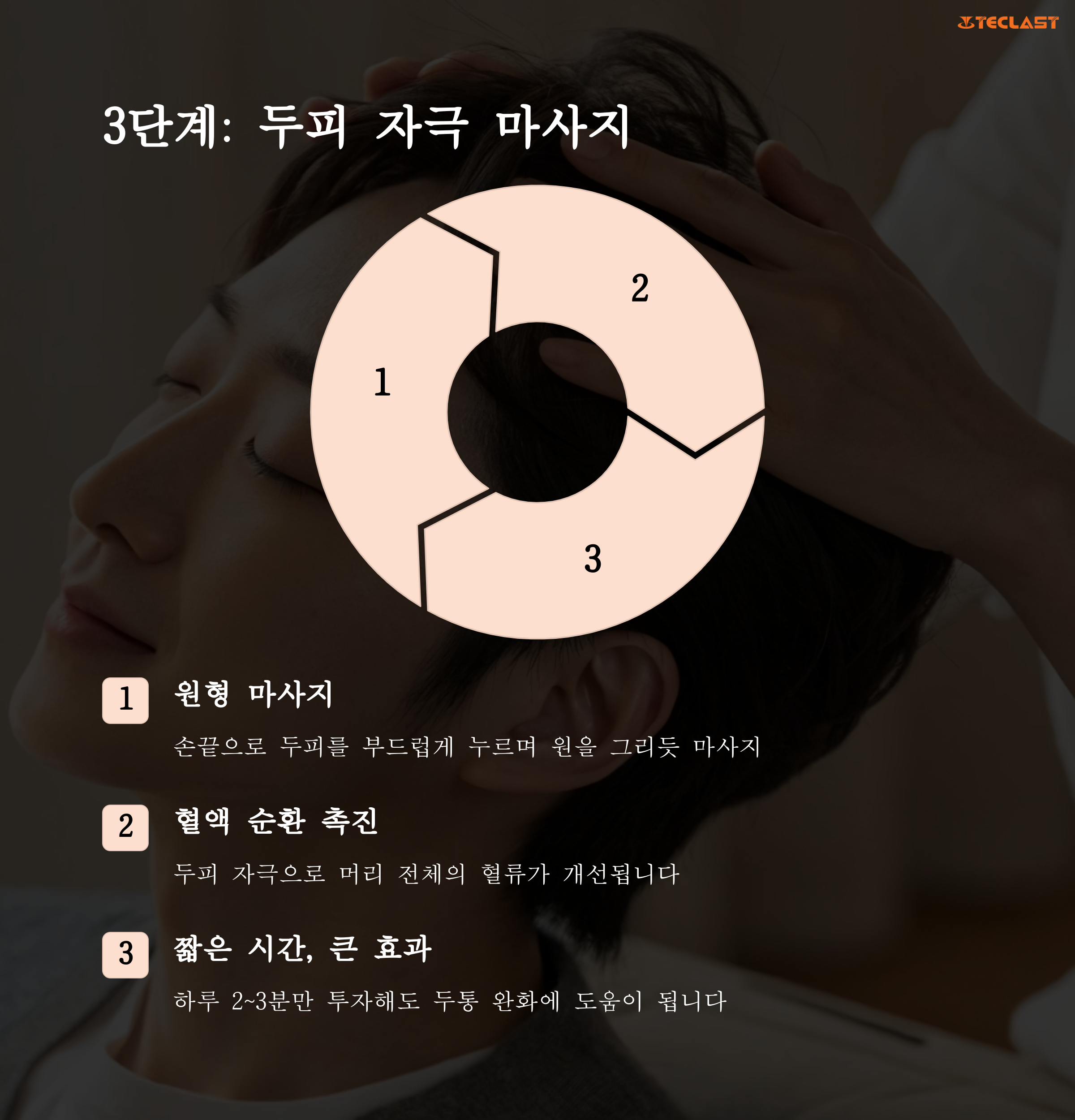 두피는 우리 몸에서 생각보다 예민한 부위입니다. 스트레스나 긴장이 쌓이면 이마와 정수리, 후두부까지 근육이 수축되면서 혈류가 감소하고, 두통으로 이어지기 쉽죠. 그래서 저는 다음과 같은 방식으로 매일 두피 자극을 하고 있어요: