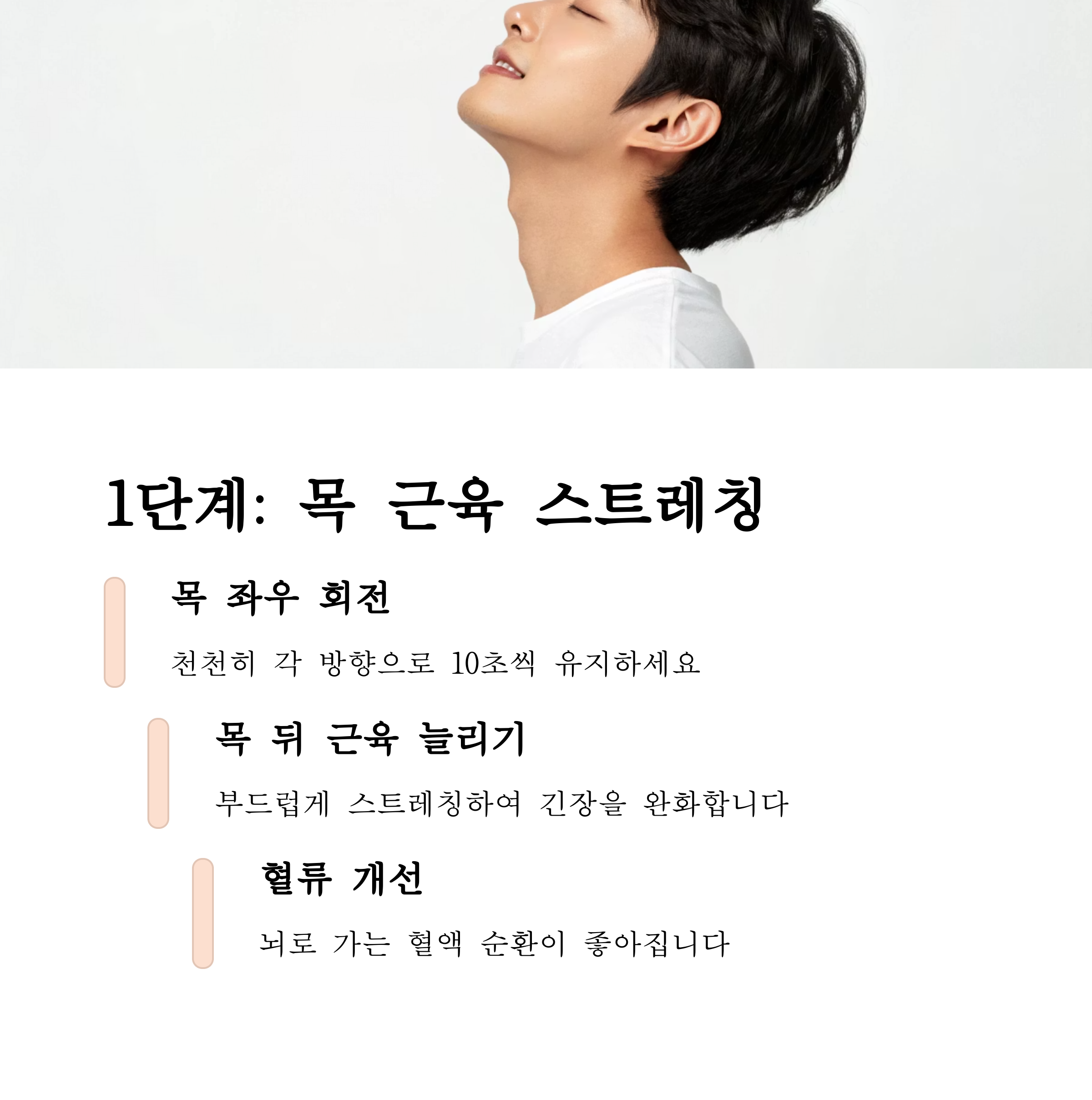 목이나 어깨 근육부터 풀어주는 스트레칭이 가장 효과적이며, 통증 유발 근육을 먼저 푸는 것이 좋아요.