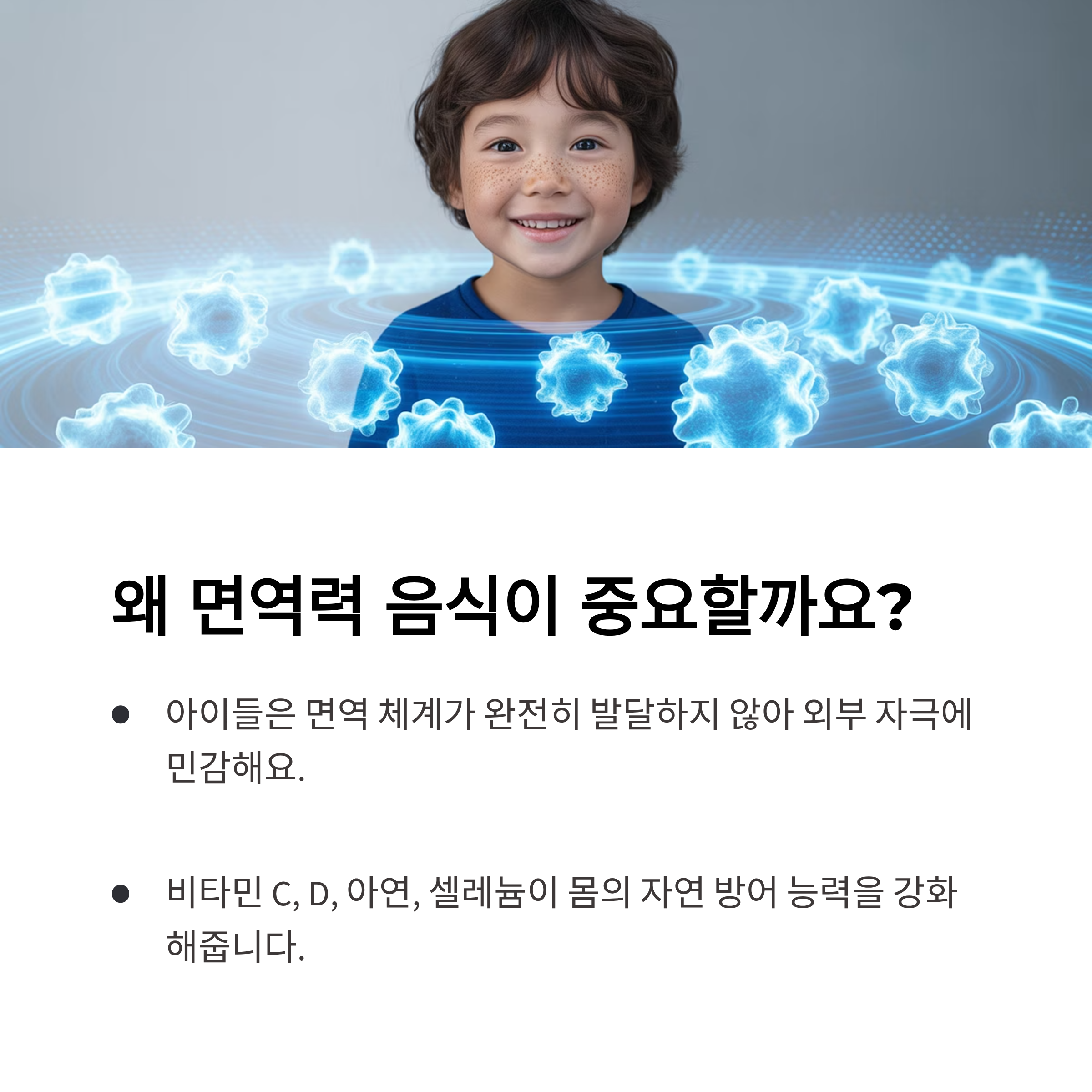면역력은 우리 몸이 질병이나 바이러스, 세균과 싸우는 힘이에요. 특히 성장기 아이들은 면역 체계가 아직 완전히 발달하지 않았기 때문에 외부 자극에 더 민감하죠. 그래서 평소에 면역력을 높이는 음식을 꾸준히 섭취하는 것이 중요해요. 식사를 통해 비타민 C, 비타민 D, 아연, 셀레늄 같은 영양소를 충분히 공급받으면, 몸의 자연 방어 능력이 강화돼 감염병을 예방하는 데 큰 도움이 됩니다.