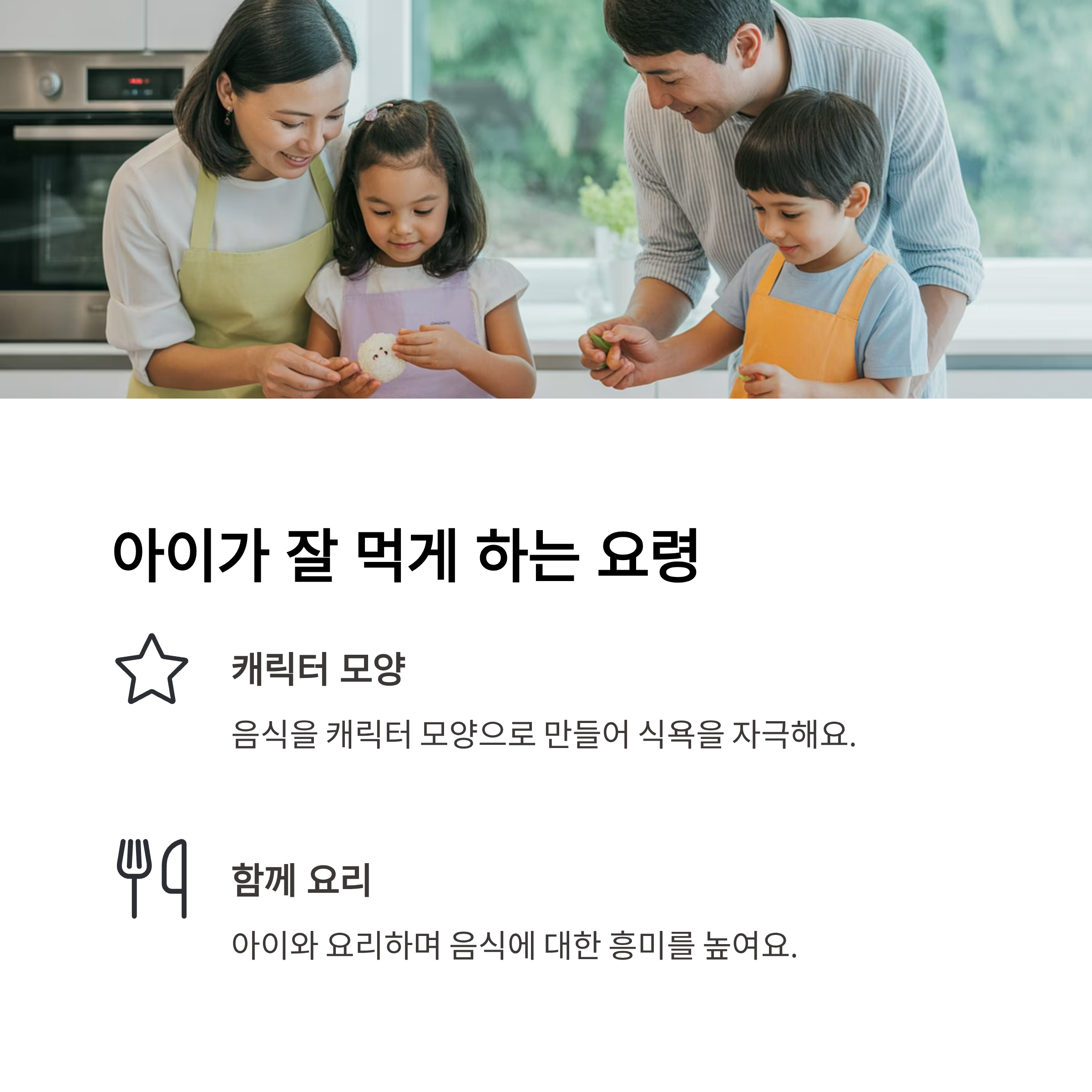 음식을 재미있게 꾸미고, 아이와 함께 요리 과정에 참여시키면 효과적이에요.