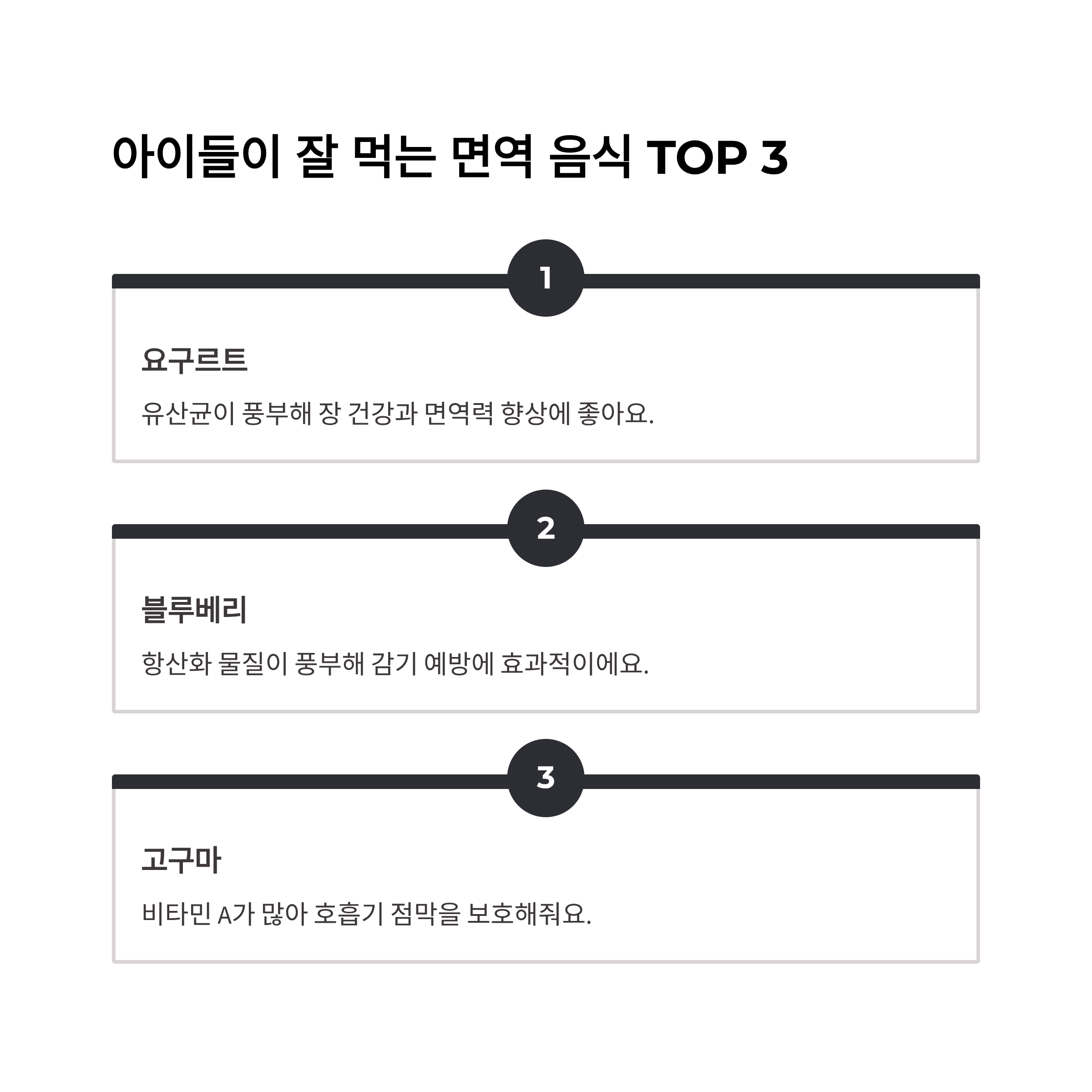 - 요구르트: 유산균이 풍부해 장 건강과 면역력 향상에 좋아요.