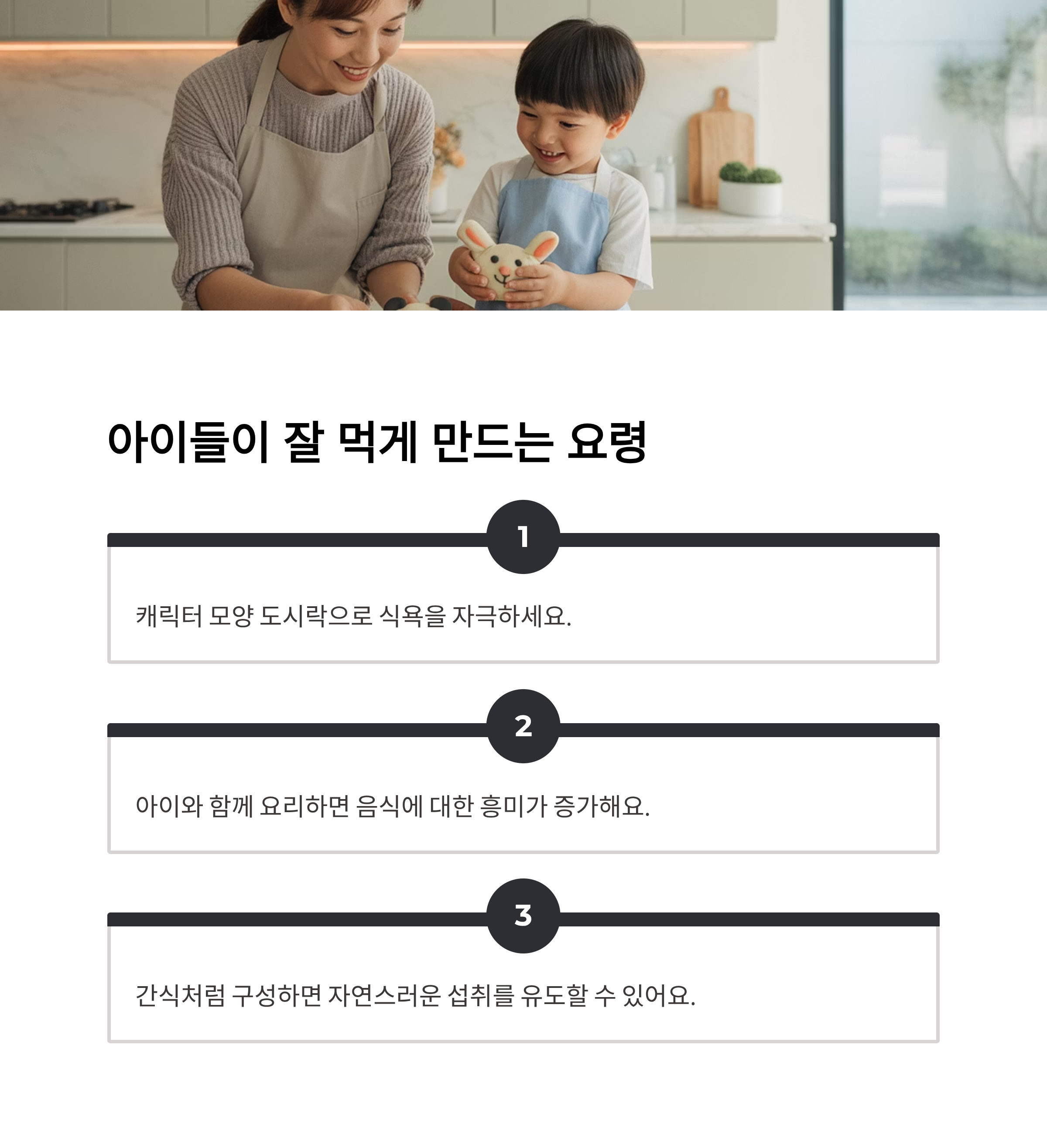 음식을 재미있게 꾸미고, 아이와 함께 요리 과정에 참여시키면 효과적이에요.