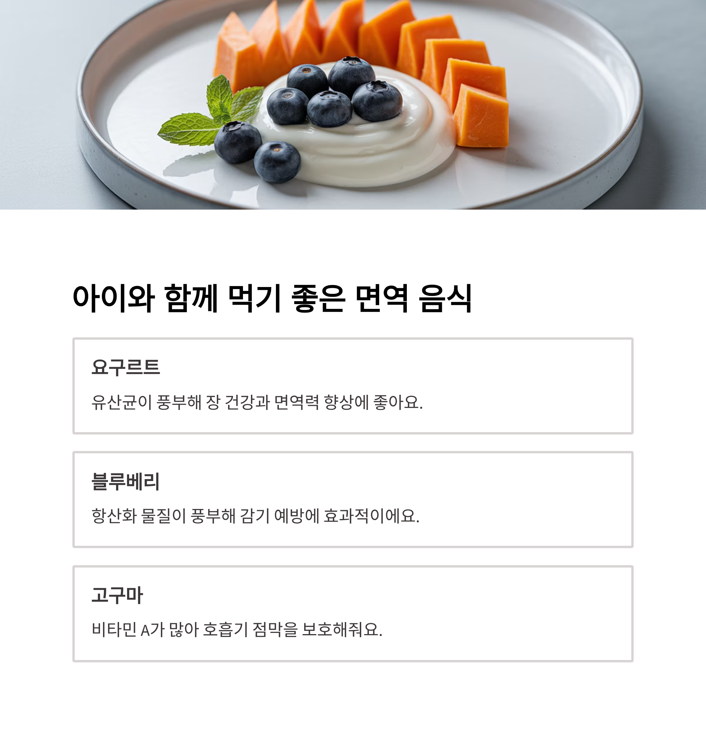 - 요구르트: 유산균이 풍부해 장 건강과 면역력 향상에 좋아요.