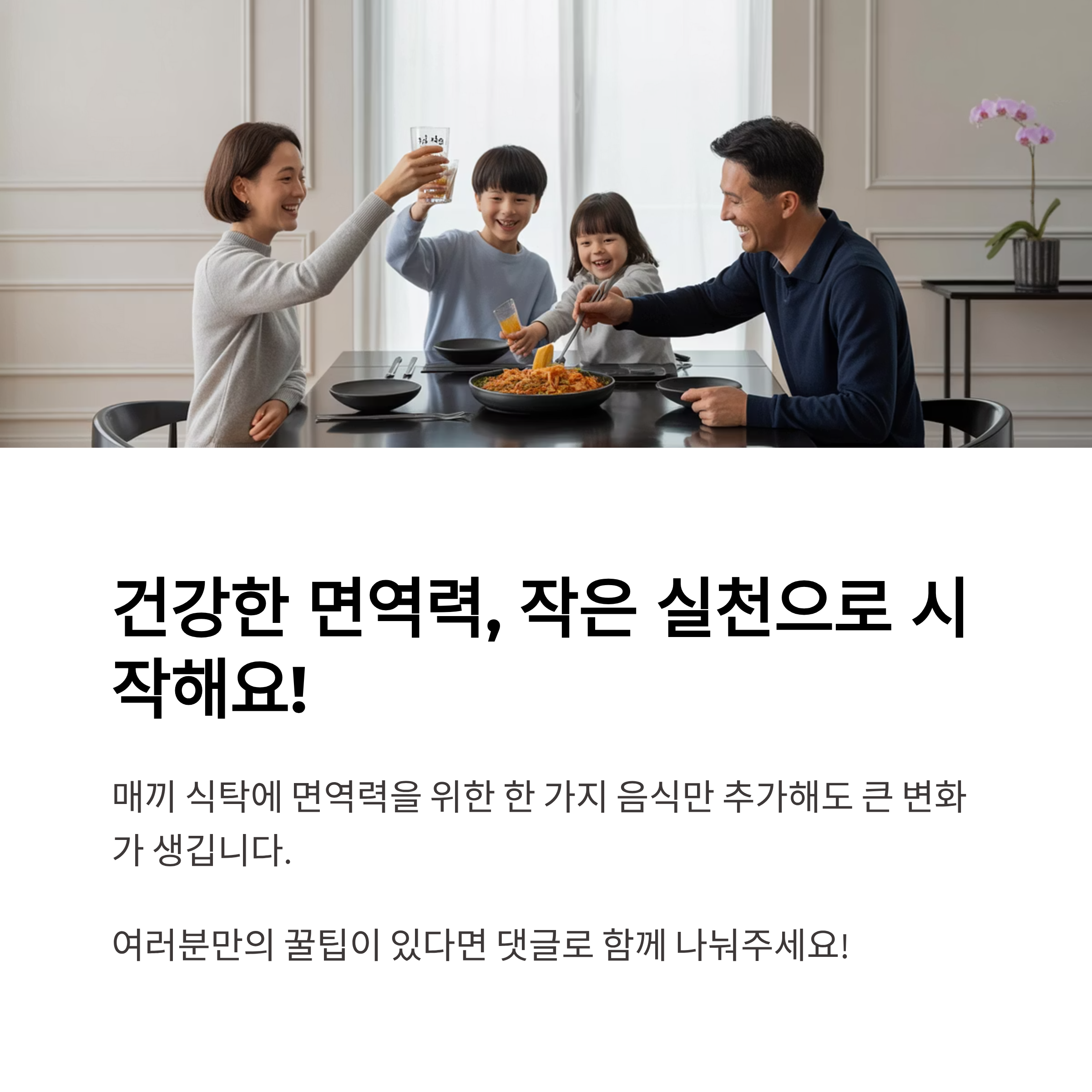 아이의 건강을 지키는 가장 좋은 방법은 바로 집밥이 아닐까요? 매끼 식탁에 면역력을 위한 한 가지 음식만 추가해도 큰 변화가 생깁니다. 저는 아이와 함께 브로콜리를 데쳐서 먹거나, 요구르트를 믹스볼로 만들며 식사 시간이 더 즐거워졌어요. 여러분도 아이와 함께 건강한 면역 식단을 실천해 보세요. 혹시 여러분만의 꿀팁이 있다면 댓글로 함께 나눠요. 작은 실천이 큰 건강으로 돌아올 거예요!