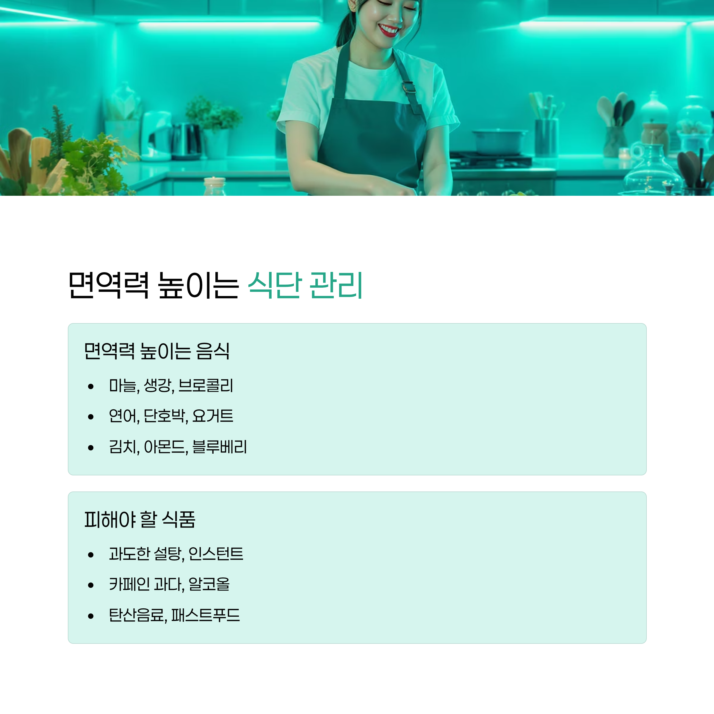 | 과도한 설탕, 인스턴트 라면, 튀김류 | 마늘, 생강, 브로콜리, 연어, 단호박 |