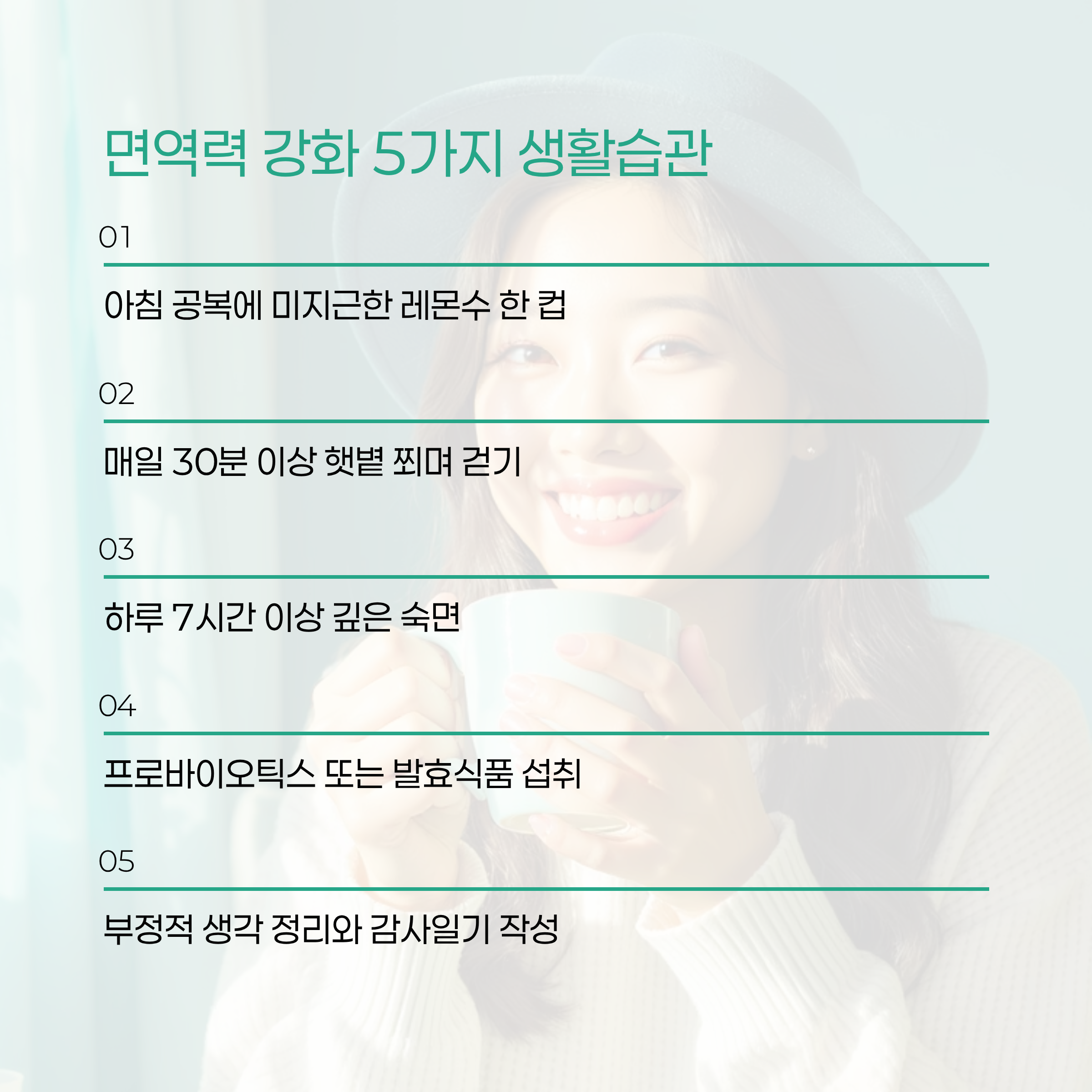 면역력은 타고나는 것보다 매일 쌓아가는 습관이 훨씬 더 중요합니다. 다음 5가지는 제가 매일 실천하며 효과를 본 루틴이에요. 하나씩 따라 하시다 보면 몸이 정말 달라지는 걸 느끼실 거예요!