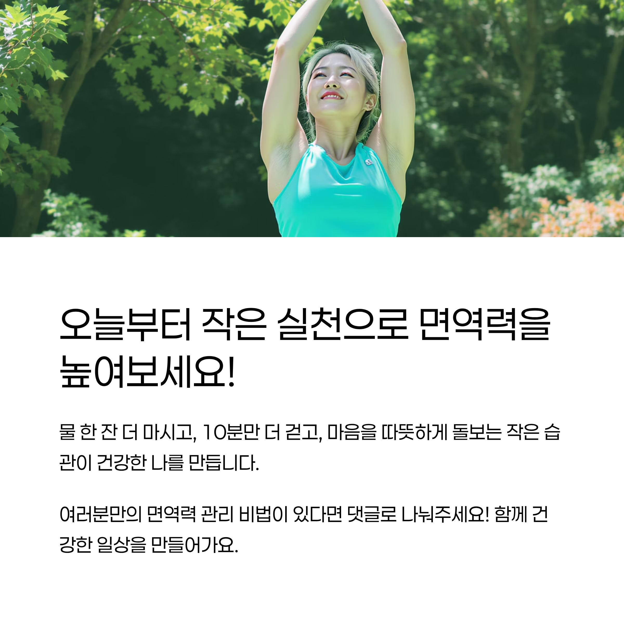 면역력은 마법처럼 하루아침에 생기는 것이 아닙니다. 저도 예전엔 한 해에 몇 번씩 감기로 고생했는데, 지금은 건강 루틴을 꾸준히 지키면서 1년에 한 번도 감기 안 걸리는 날이 많아졌어요. 여러분도 오늘부터 작은 실천을 하나씩 시작해 보세요. 물 한 잔을 더 마시고, 10분만 더 걷고, 마음을 따뜻하게 돌보는 것. 이런 사소한 실천들이 쌓여 진짜 ‘건강한 나’를 만들어줄 거예요. 혹시 여러분만의 면역력 관리 비법이 있다면 댓글로 함께 나눠주세요. 우리 모두 함께 더 건강한 일상을 만들어가요!