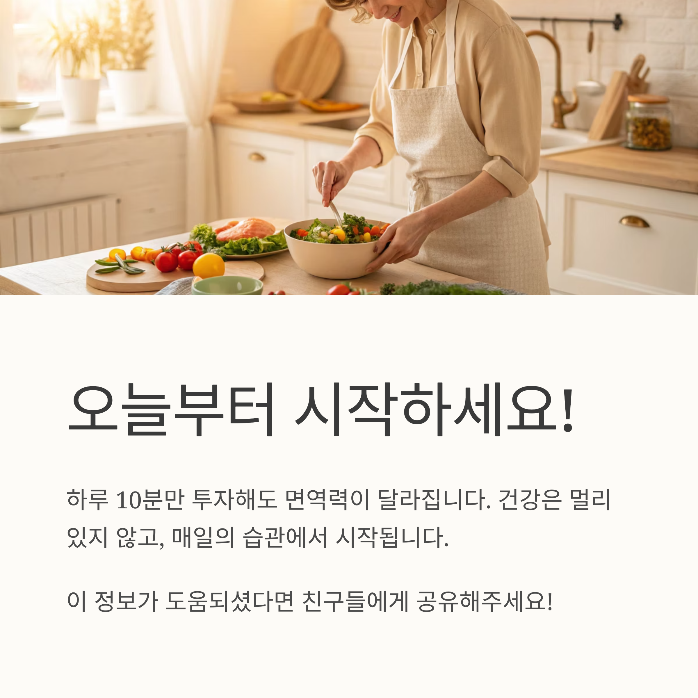 바쁜 일상 속에서도 10분만 투자하면 오늘 면역 채소를 충분히 챙길 수 있어요. 아래 체크리스트로 오늘 하루 식단을 다시 점검해 보세요!
