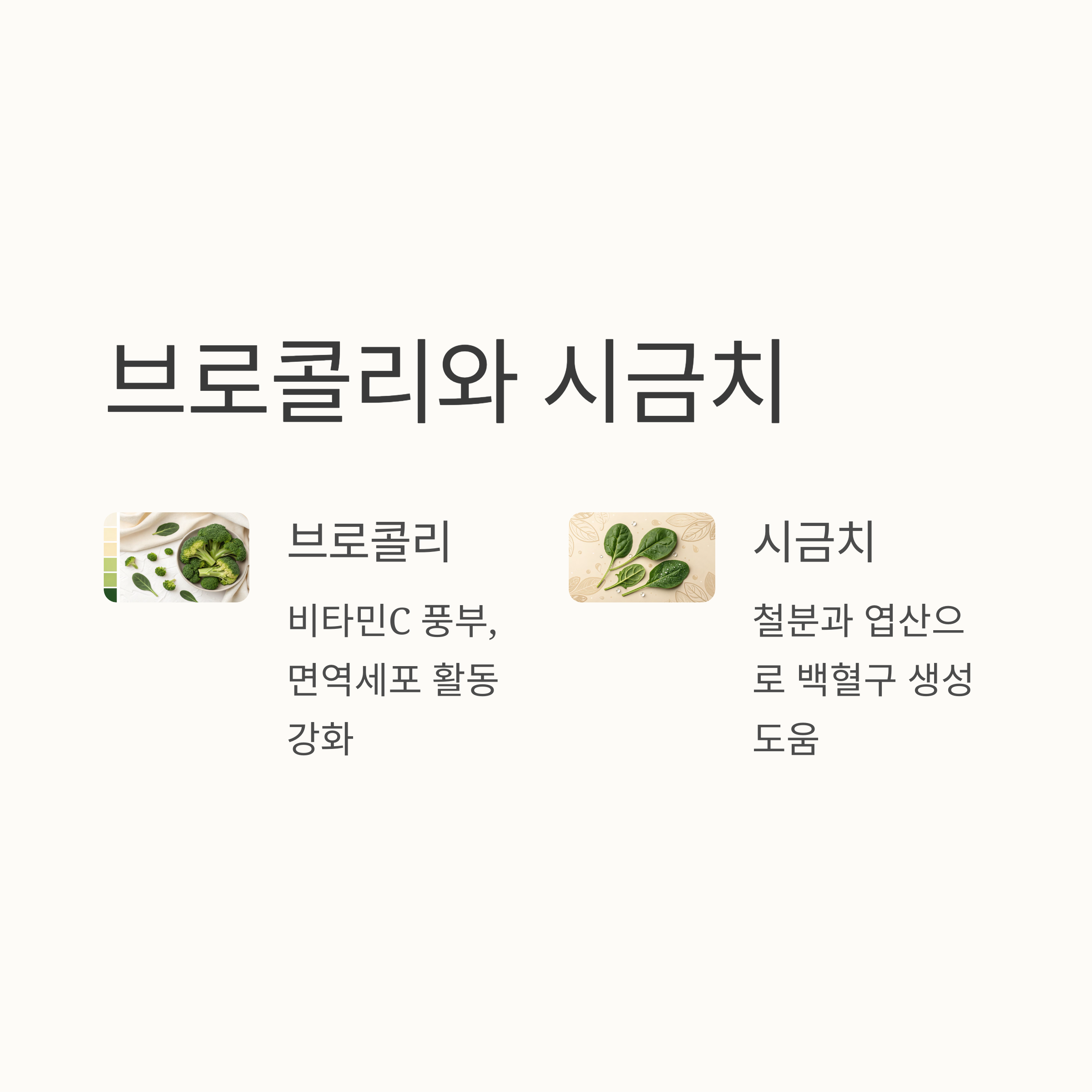 시금치는 피로 해소에 좋은 채소로 널리 알려져 있지만, 사실 면역력 강화를 위한 핵심 채소이기도 합니다. 시금치에 들어있는 철분과 엽산, 마그네슘은 백혈구 생성을 도와 감염에 대한 방어력을 높여주며, 특히 빈혈이 잦은 분들에게도 꼭 필요한 채소예요. 생으로 먹기보다 데쳐서 무침이나 볶음으로 즐기면 영양도 더 흡수됩니다.
