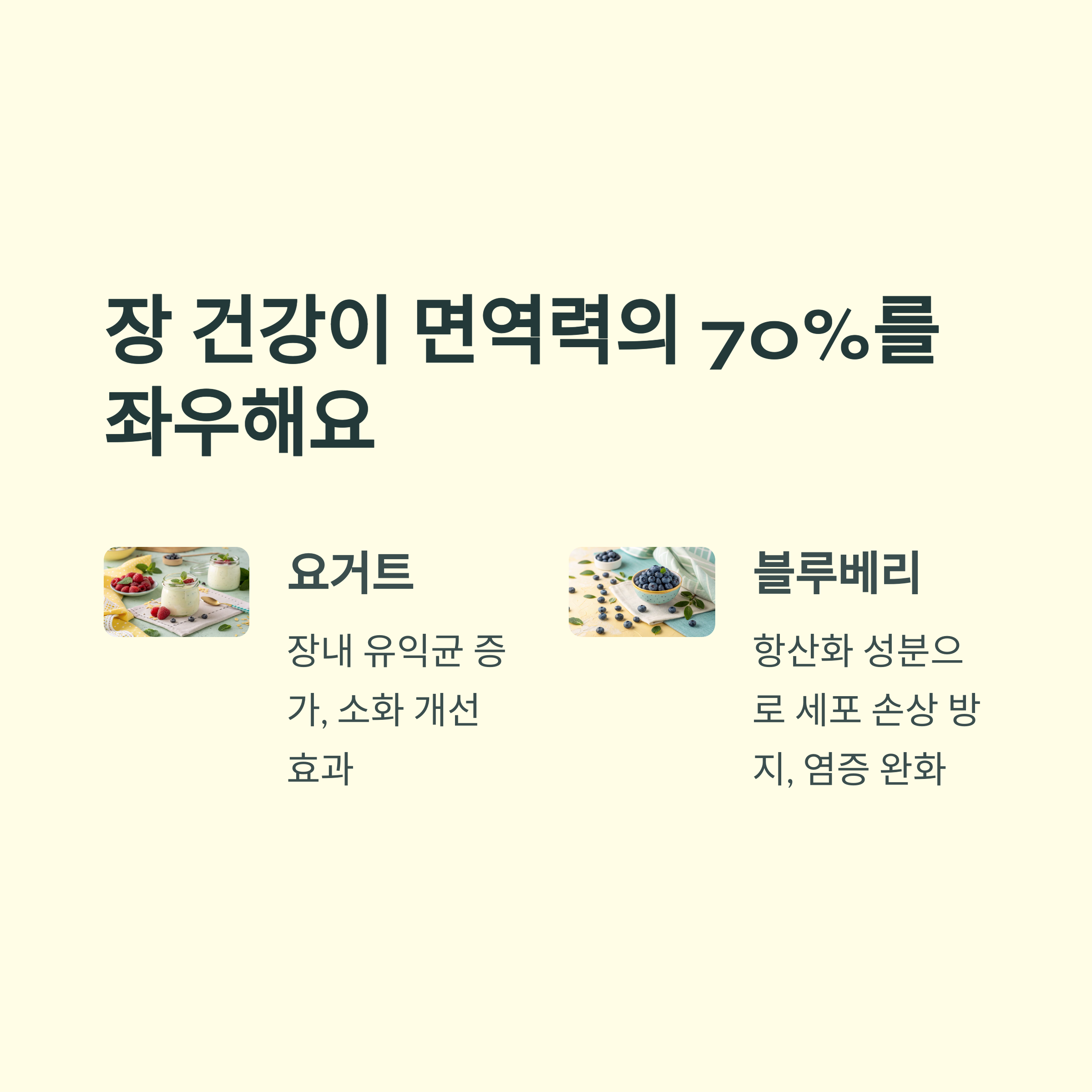 요즘 면역력을 논할 때 빠지지 않는 키워드가 바로 '장 건강'이에요. 전체 면역 세포의 70%가 장에 있다는 말, 들어보셨죠? 요거트에 들어 있는 유산균은 장내 유익균을 늘려주고, 블루베리는 강력한 항산화 성분으로 세포 손상을 막아줘요. 아침 식사로 간편하게 이 조합을 챙긴다면 면역력 향상은 물론 다이어트에도 도움이 되죠.