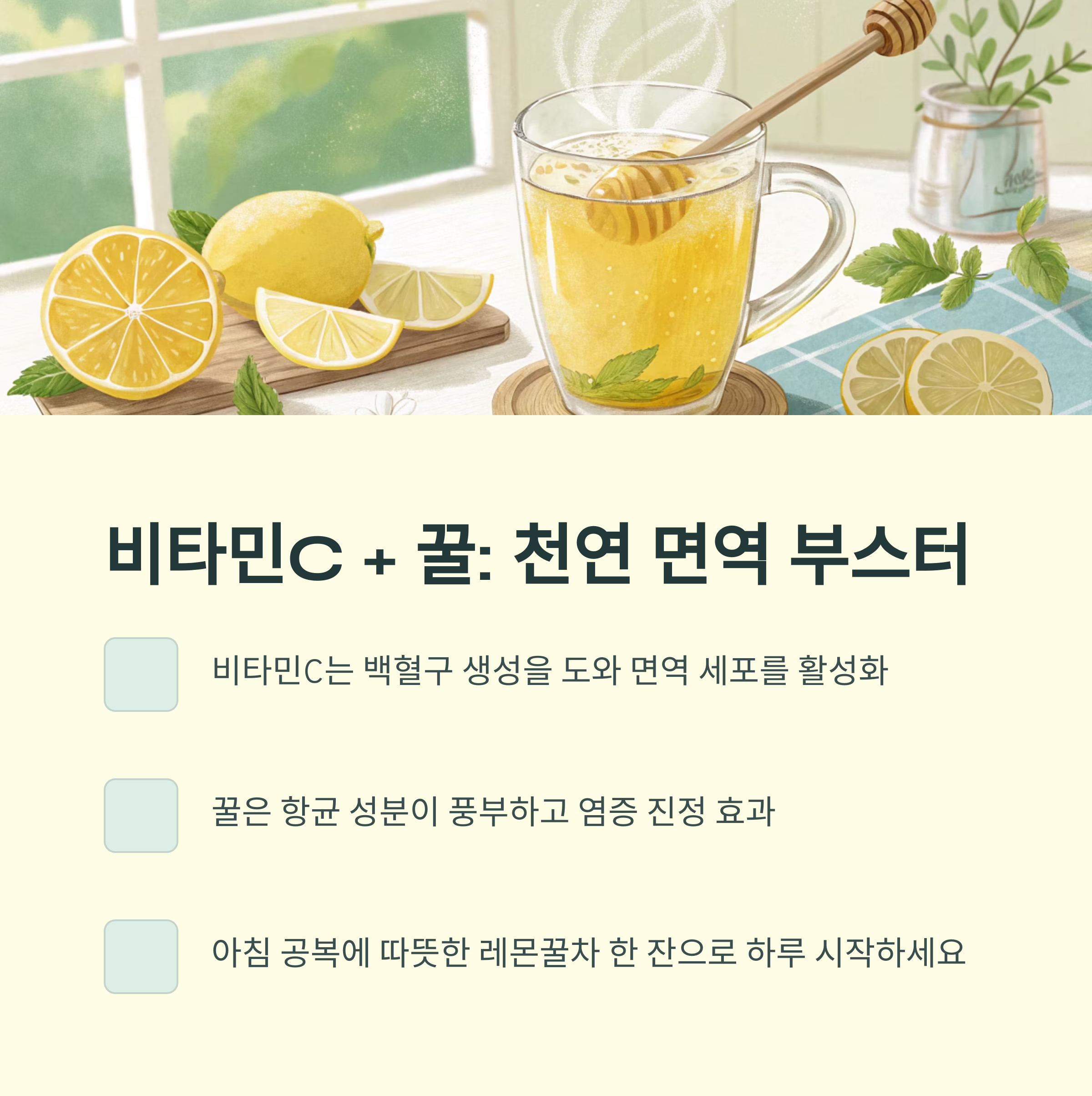 비타민C가 우리 몸의 백혈구 생성을 도와 면역 세포를 활성화시키고, 꿀은 염증을 진정시키는 역할을 하기 때문에 이 두 가지는 찰떡궁합이라고 할 수 있어요. 아침 공복에 따뜻하게 한 잔 마시면 속도 편하고 몸도 따뜻해지는 느낌, 저만 느낀 거 아니죠?