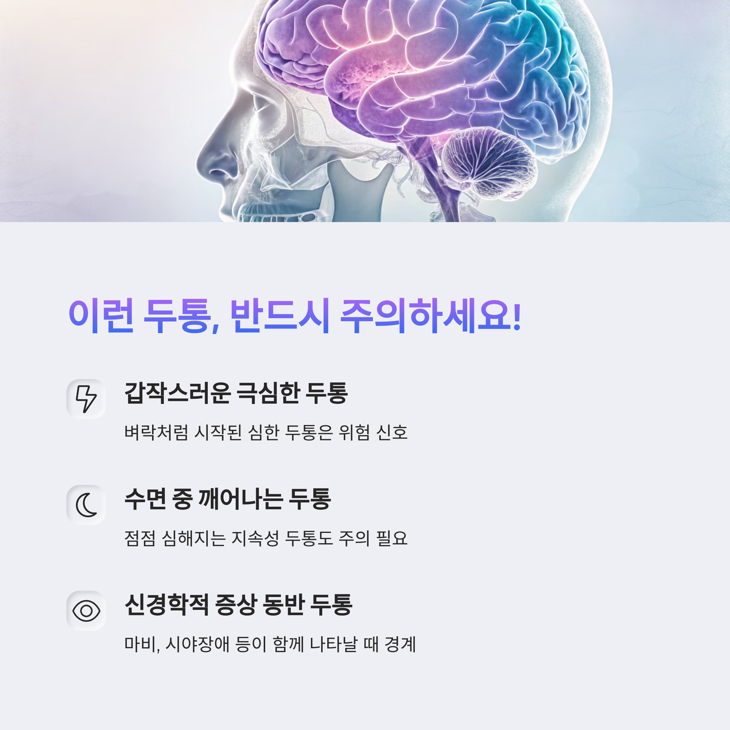 진통제에도 반응하지 않고 점점 악화된다면 뇌 내부 질환 가능성을 배제할 수 없으므로 정밀 검사가 필요합니다.
