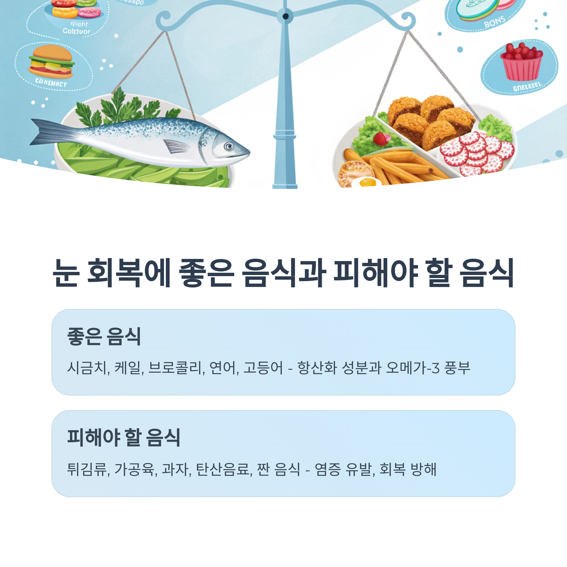 회복을 방해하거나 염증을 악화시킬 수 있는 음식은 반드시 피해야 합니다. 특히 튀긴 음식, 가공육, 고염분 식품, 당분이 많은 디저트, 탄산음료는 눈뿐만 아니라 전반적인 회복에도 해롭습니다. 다음 표를 참고해주세요.