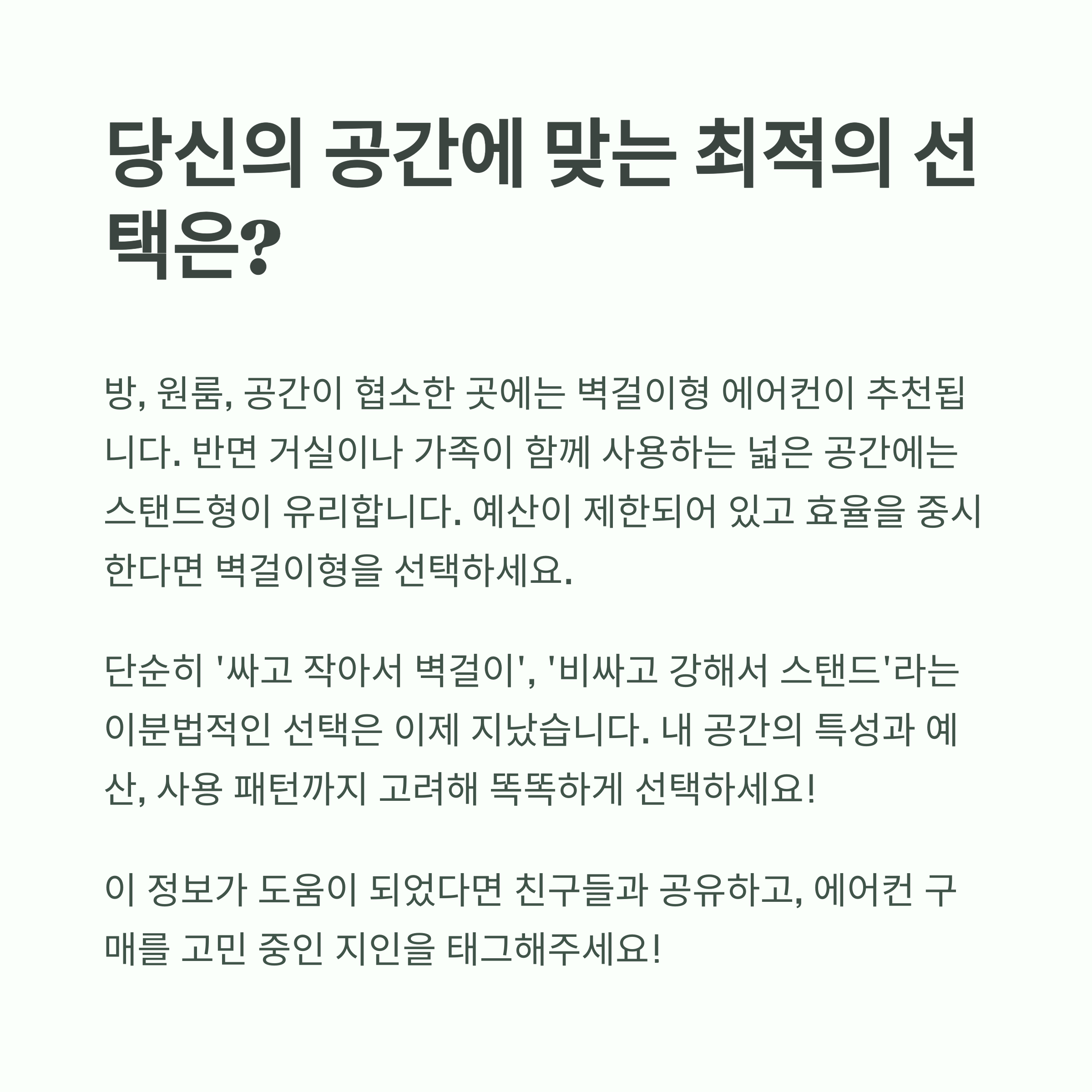 - 방, 원룸, 공간이 협소한 곳 → 벽걸이형 에어컨 추천