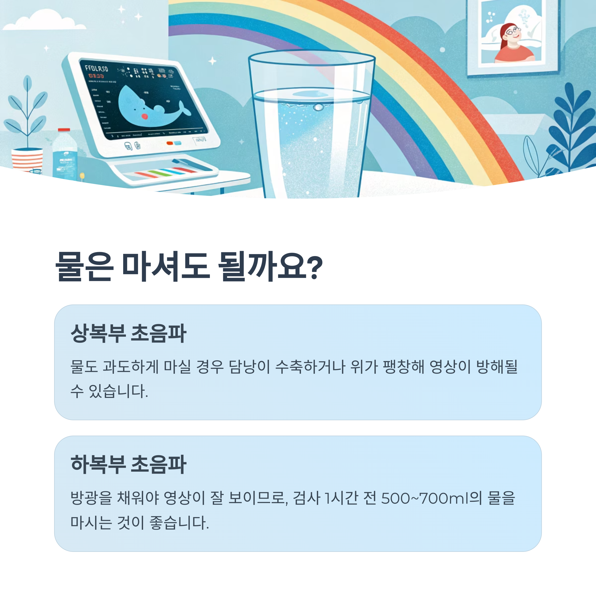 중요 포인트: 복부초음파는 금식 여부 외에도 물 섭취 시점이 검사 정확도에 영향을 주므로,
